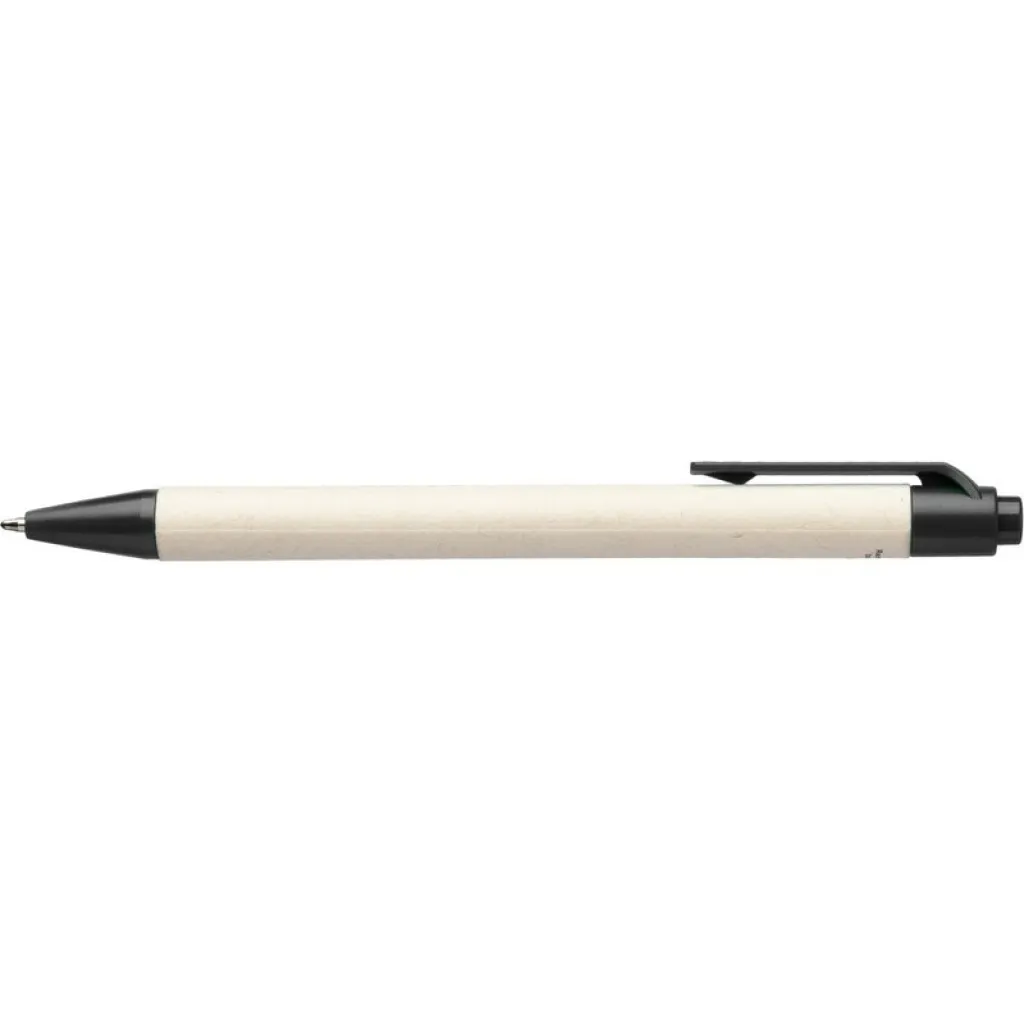 Kemijska olovka s klipsom u boji. Može se pričvrstiti na notes ili košulju. Sadrži ikonu recikliranog ABS-a na proizvodu. Razlikuje se po svom neobičnom materijalu. Proizvod izrađen od recikliranih kartonskih kutija za mlijeko i ABS-a.