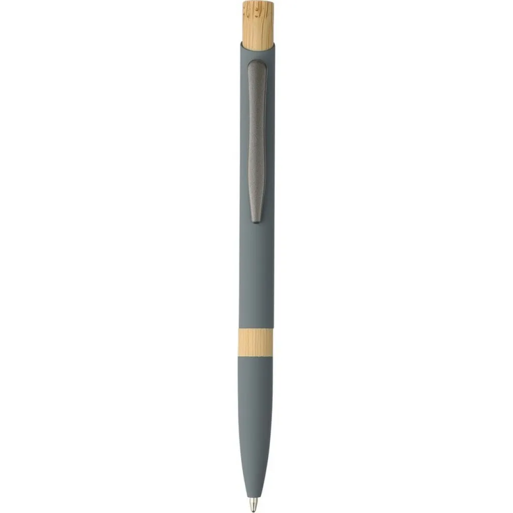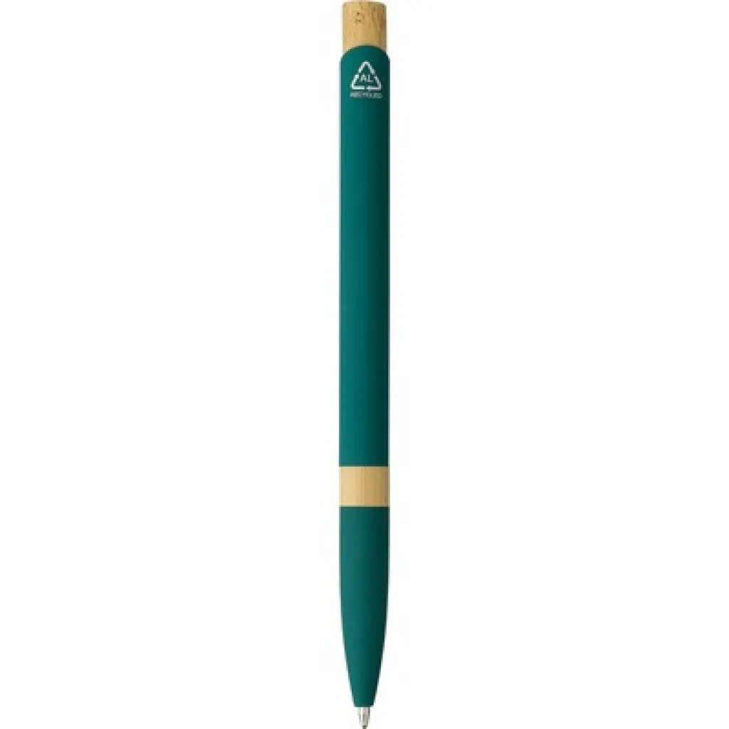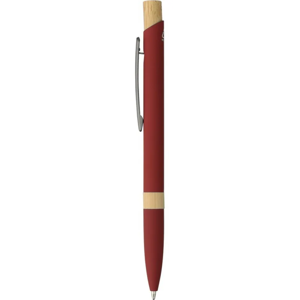 Reciklirana aluminijska kemijska olovka s gumiranom završnom obradom, potiskivač od bambusa, prsten od bambusa u tijelu, ima mehanizam za potiskivanje, veličina vrha 1,0 mm, s plavom tintom s približnom duljinom pisanja od 800 metara, uključuje ikonu recikliranog aluminija na proizvodu.