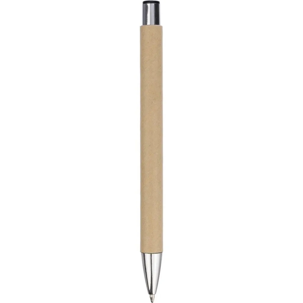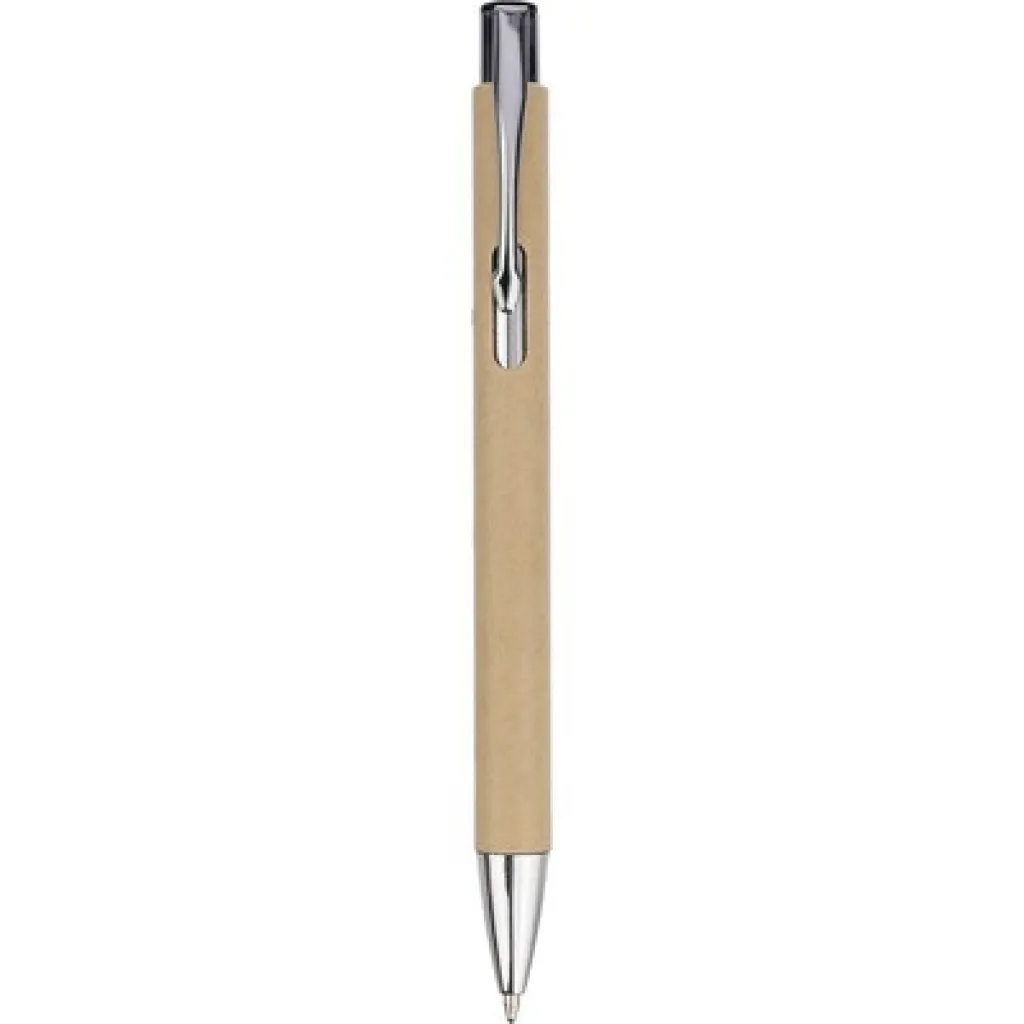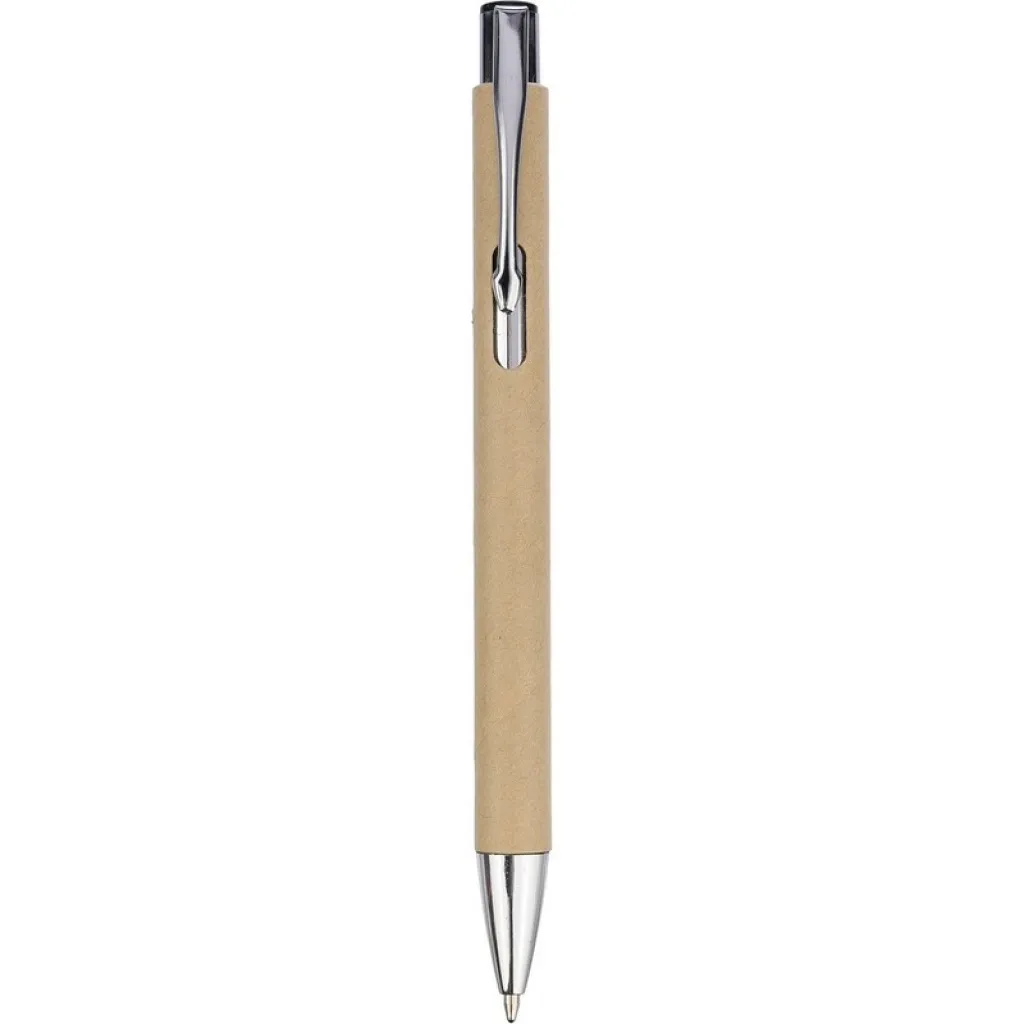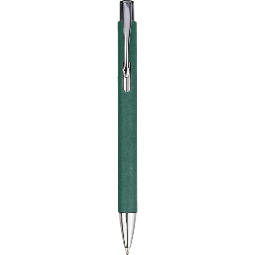 Kemijska olovka s klipsom za jednostavno pričvršćivanje na džep ili koricu bilježnice. Crna tinta. Tijelo izrađeno od recikliranog papira, klipsa od metala, vrh od plastike.