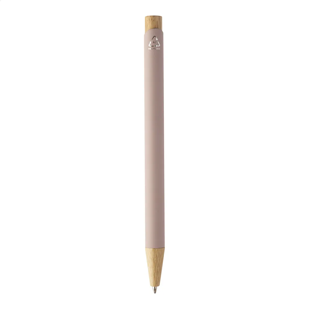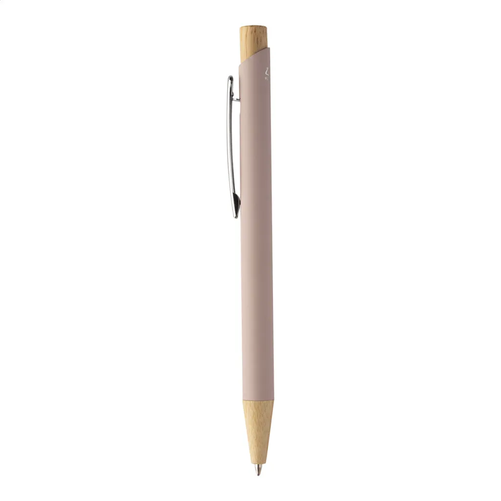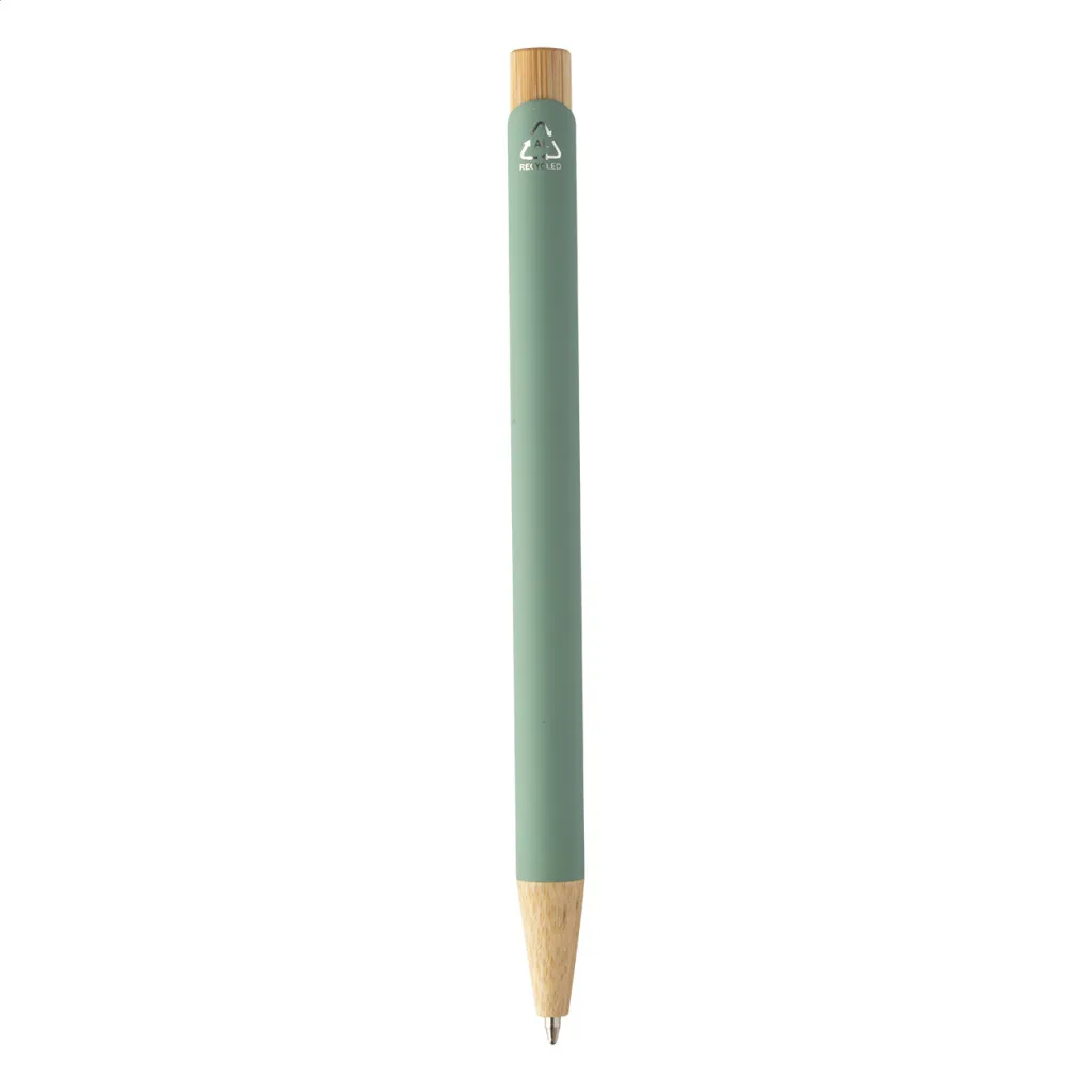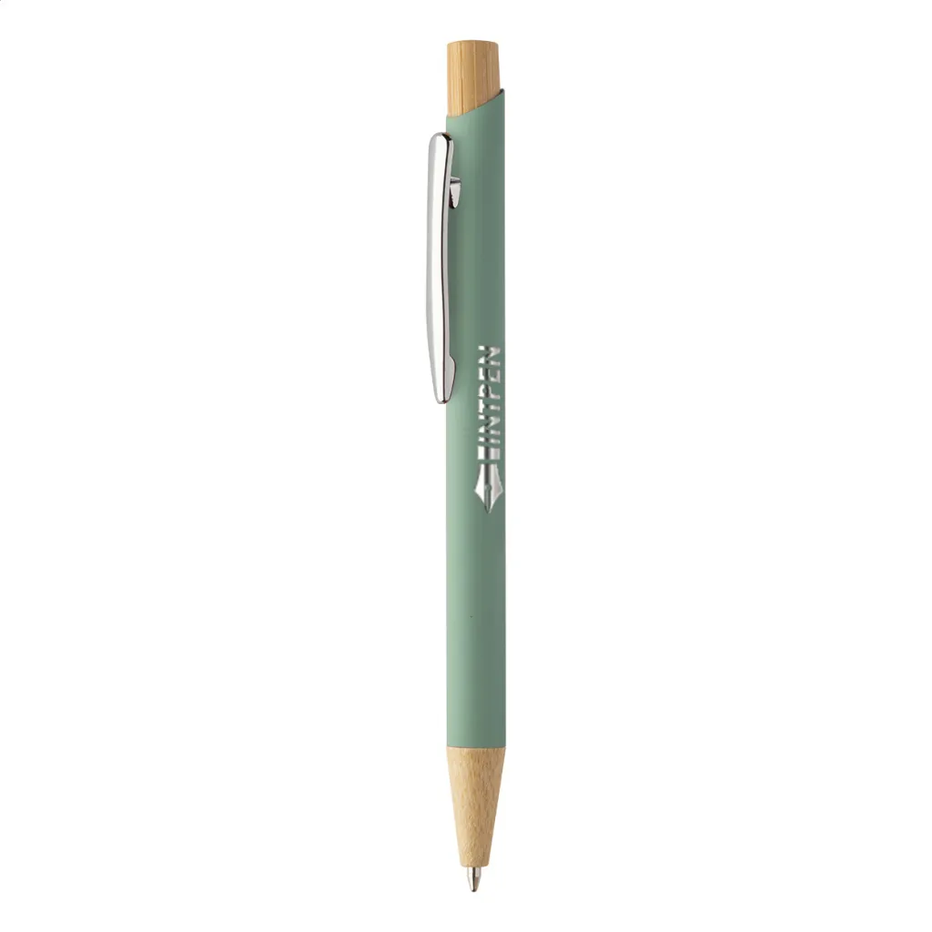Kemijska olovka od recikliranog aluminija s dijelovima od bambusa, gumiranom završnom obradom i kromiranom klipsom. S posebnim premazom za zrcalno lasersko graviranje. S plavim punjenjem.