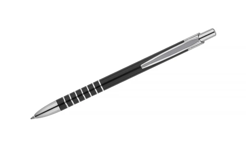Jednostavna aluminijska kemijska olovka dekorirana širokim prstenjem. Preporuka za dotisak: laserska gravura i kolor UV dotisak.