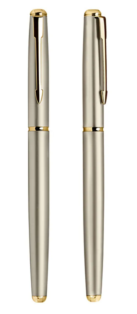 Metalna kemijska olovka sa zlatnom završnom obradom. Klasični uzorak na tijelu olovke jamči vječnu eleganciju.