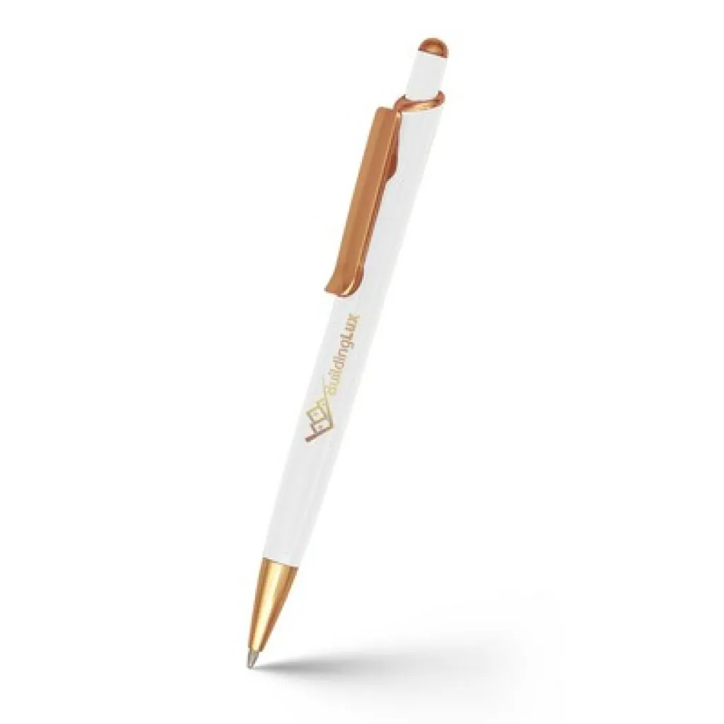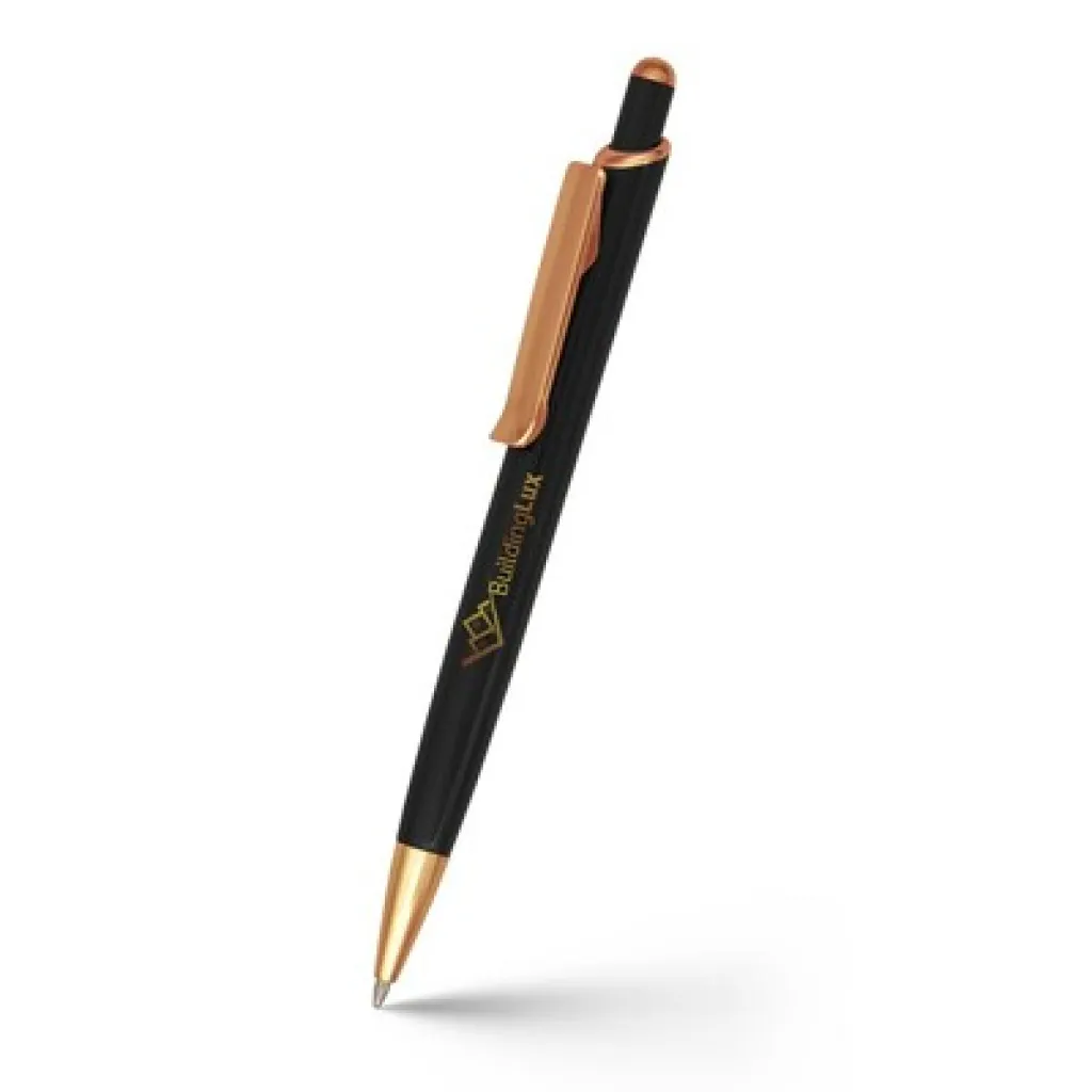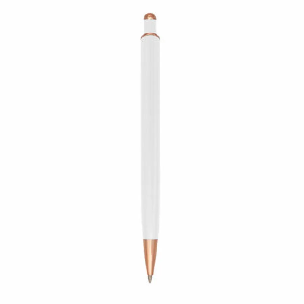 Kemijska olovka s tijelom u boji i sjajnim detaljima u ružičasto zlatnoj boji, piše plavo, proizvod izrađen od aluminija.