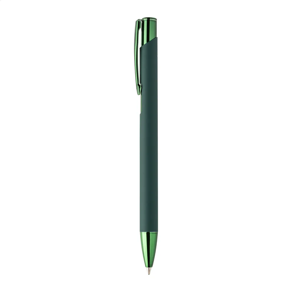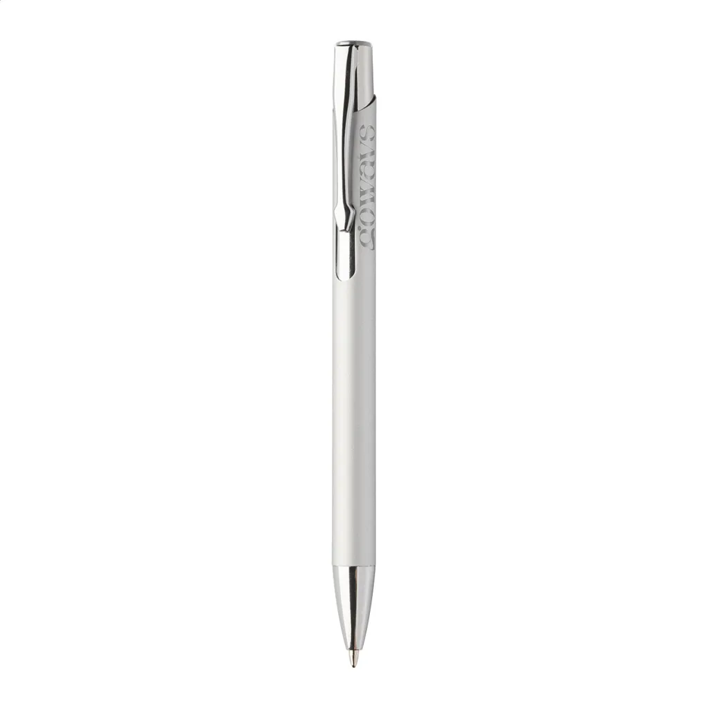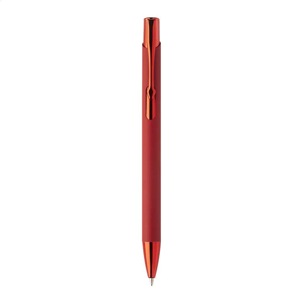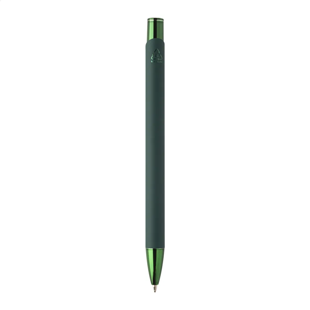 Kemijska olovka od recikliranog aluminija s gumiranim tijelom i sjajnim metalnim završnim dijelovima u boji. Sa posebnim premazom za zrcalno graviranje koje odgovara metalnim dijelovima. S plavim punjenjem.