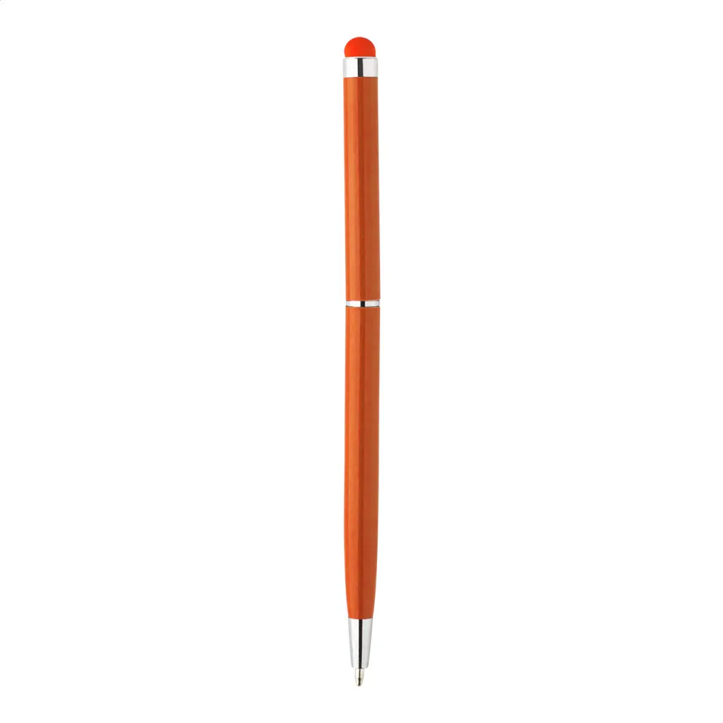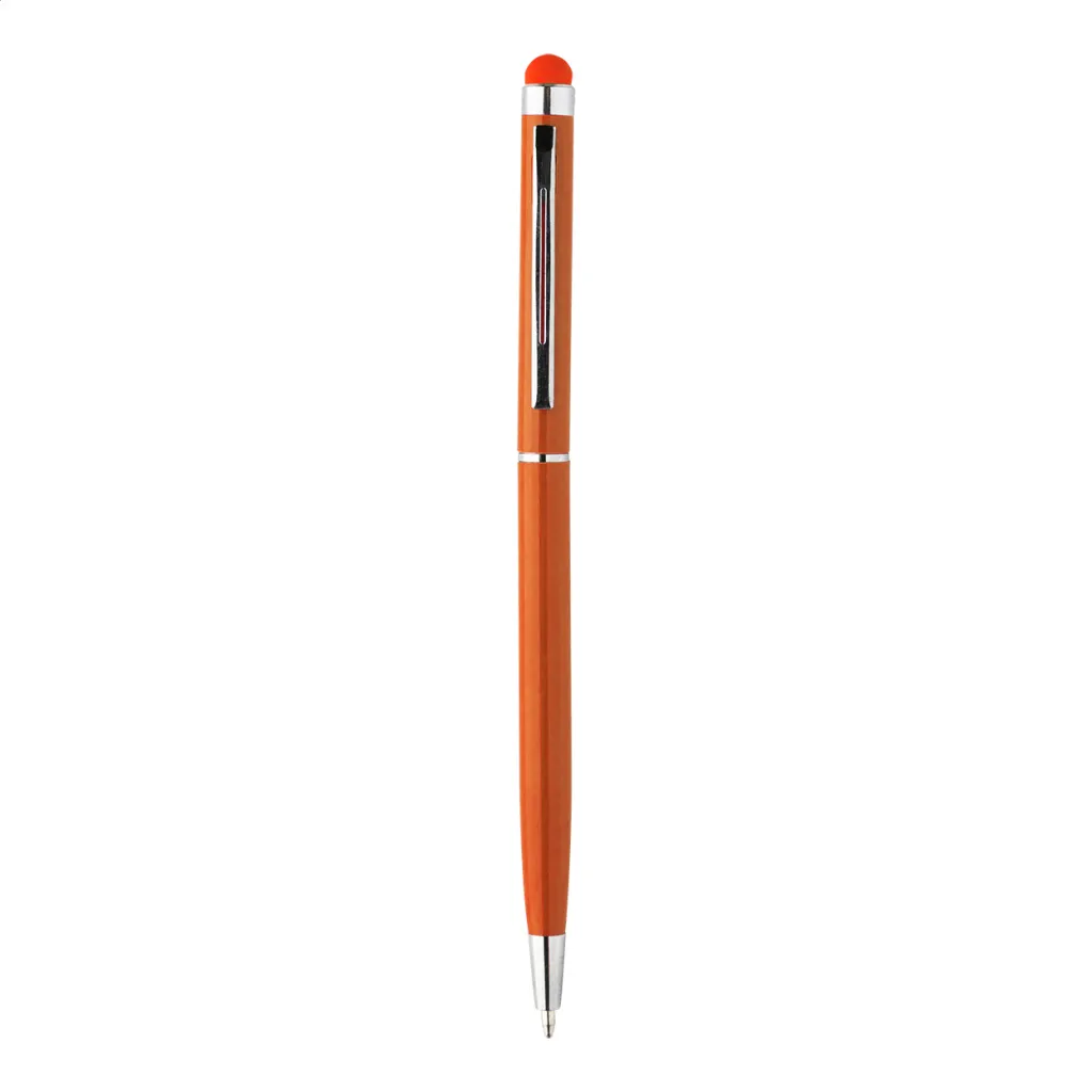 Aluminijska kemijska olovka s nastavkom za ekrane osjetljive na dodir. Gumica za ekran je u boji kemijske olovke. Plava tinta.