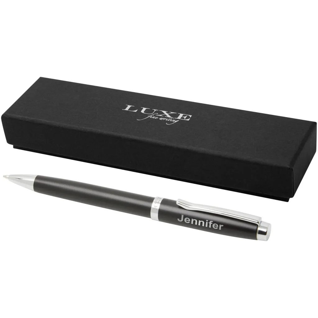 Elegantna kemijska olovka s ekskluzivnim dizajnom dostupna u tri izvrsne boje. Unaprijed napunjeno crnom tintom i pakirano u LUXE poklon kutiju.