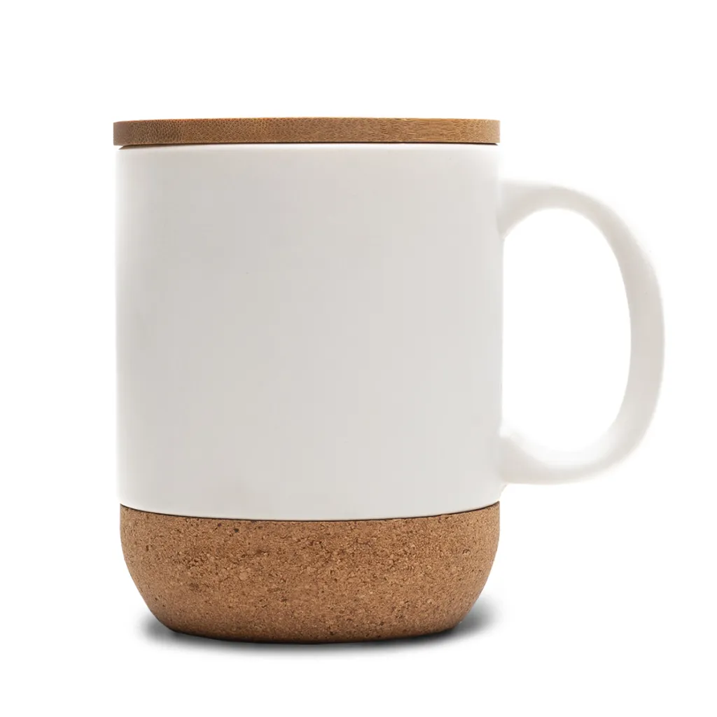 Keramička šalica s poklopcem od bambusa i postoljem od pluta. Zaapremnina 400 ml.