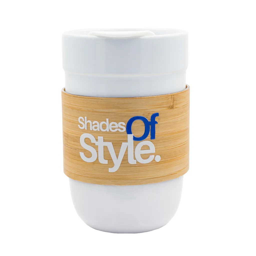 Keramička šalica s trakom od bambusa. Kapacitet: 500 ml.