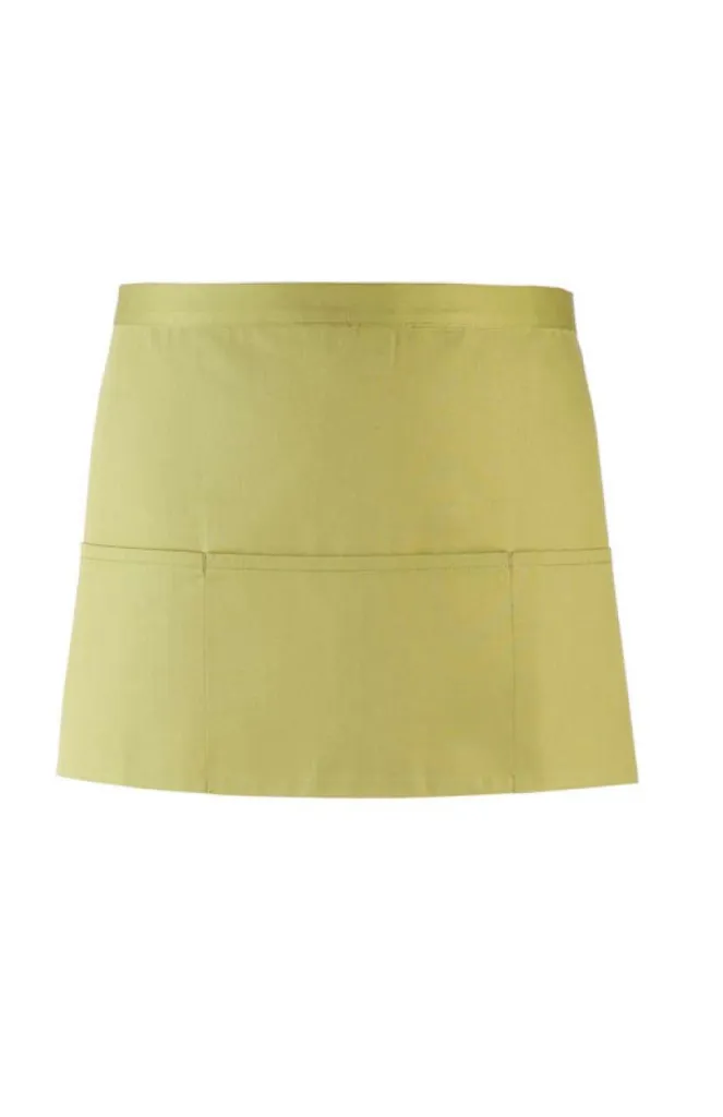 65% poliester, 35% pamučni keper, 195 g/m². Kratka pregača s 3 otvorena džepa za tablete. Vezica od 90 cm. Mjera džepa: širina 20 cm. 17 cm dubine.