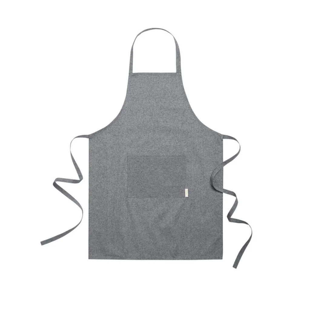 Kuhinjska pregača s prednjim džepom, izrađena od recikliranog pamuka.