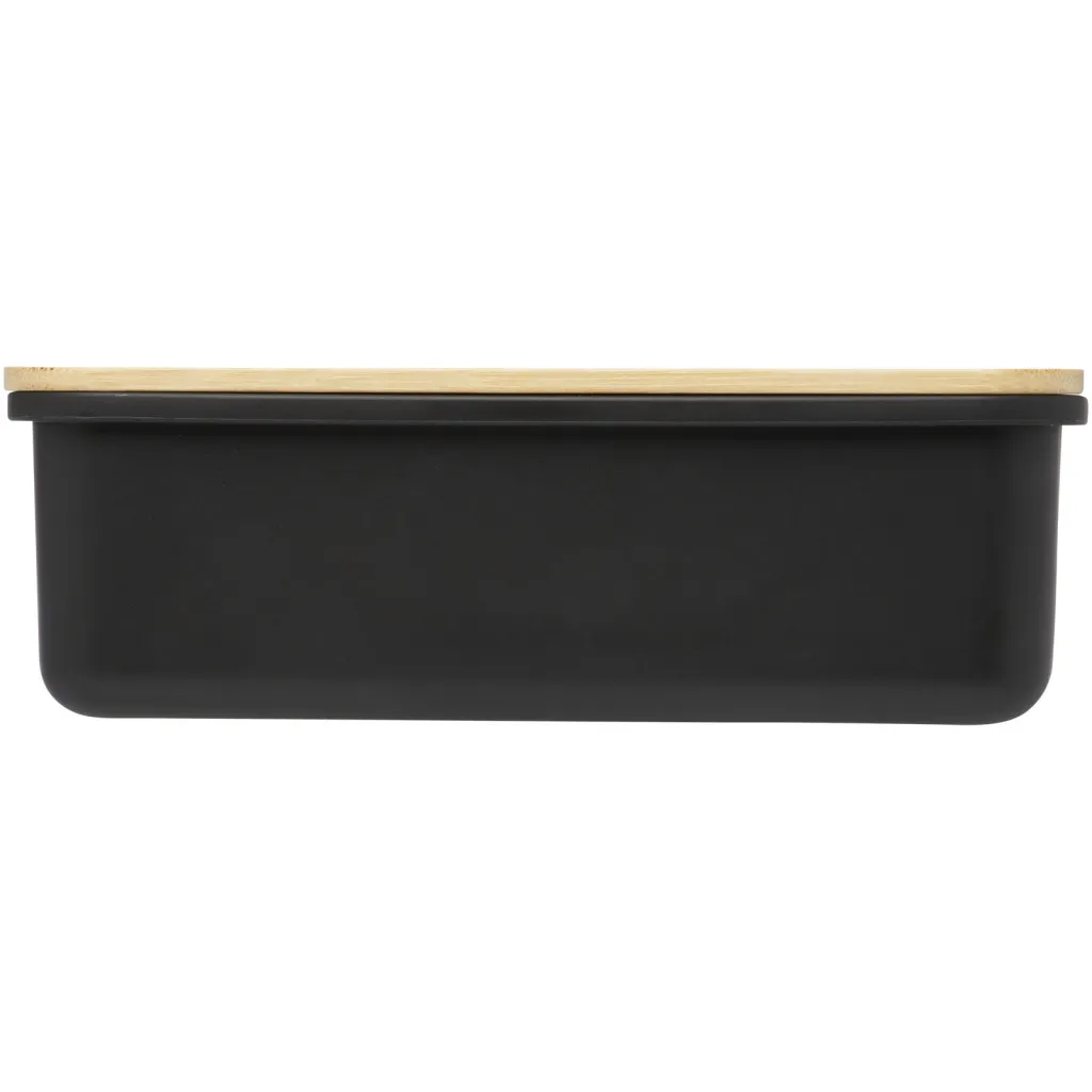 Kutija za ručak Mangi izrađena je od reciklirane plastike i ima kapacitet od 750 ml. Ima poklopac od bambusa i elastičnu traku koja drži poklopac na mjestu, osiguravajući da sadržaj ostane svjež. Kutija se može prati u perilici posuđa bez poklopca.
