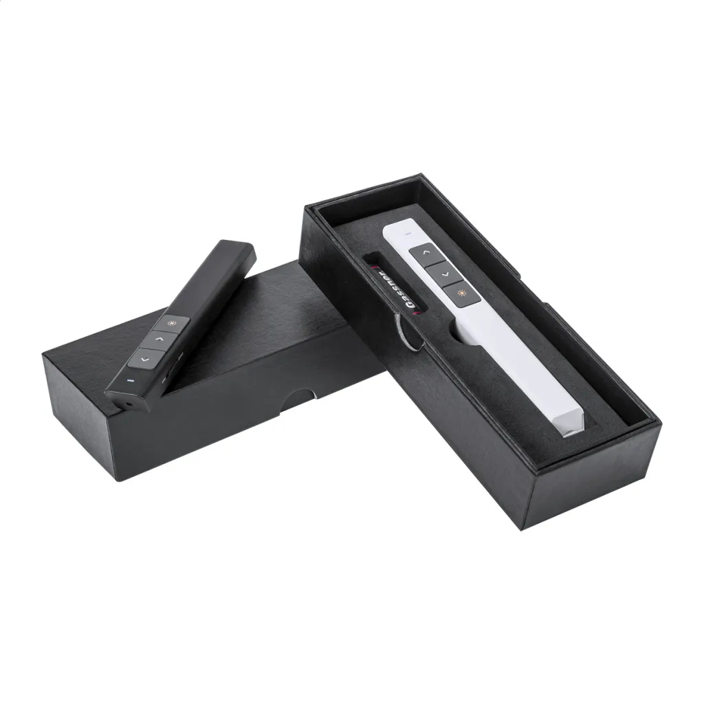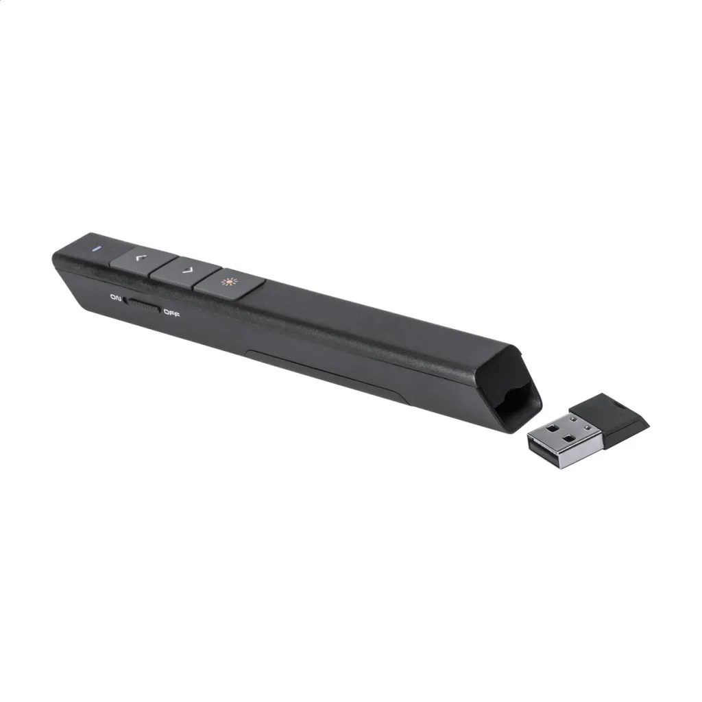 Plastični laserski pokazivač s LED svietlom i daljinskim za upravljenje prezentacijama. Pakiran u papirnatu poklon kutiju s 1 AAA baterijom.