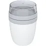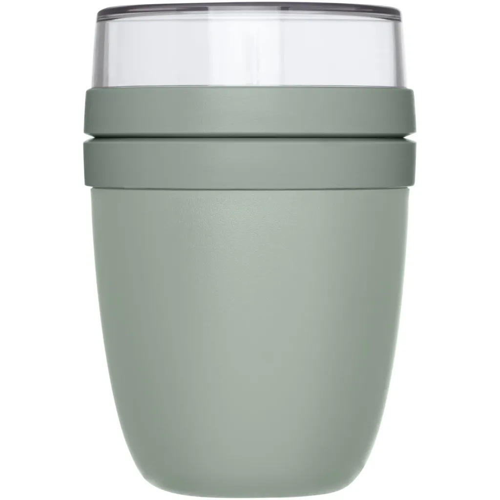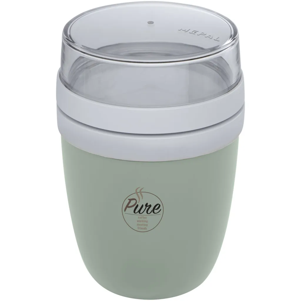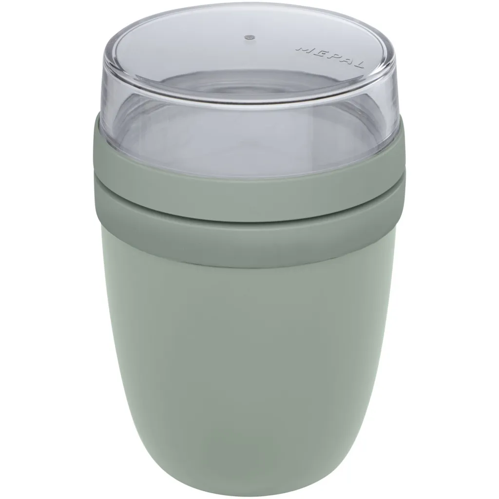 Lonac za hranu s dva različita pretinca kako bi različiti sastojci bili odvojeni. Oba spremnika imaju zaseban poklopac i stoga ostaju čista. Sadržaj gornje prozirne posude je 200 ml, što znači da može primiti oko 75 grama krute hrane. Kapacitet donjeg spremnika je 500 ml. Izrađena je od trajnog materijala i može se koristiti u zamrzivaču, mikrovalnoj pećnici (uklonite poklopac) i perilici posuđa. Gornja prozirna posuda ne smije se koristiti u mikrovalnoj pećnici. Nepropusno. Bez BPA.