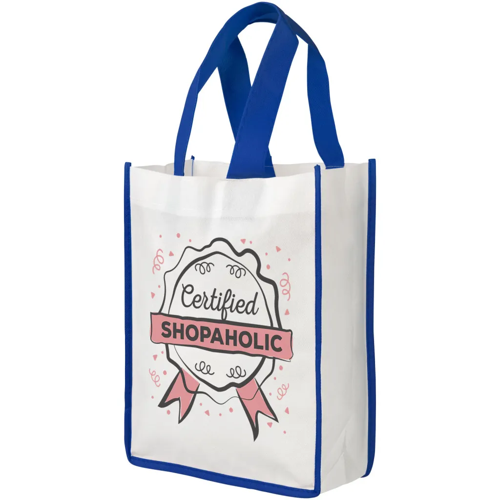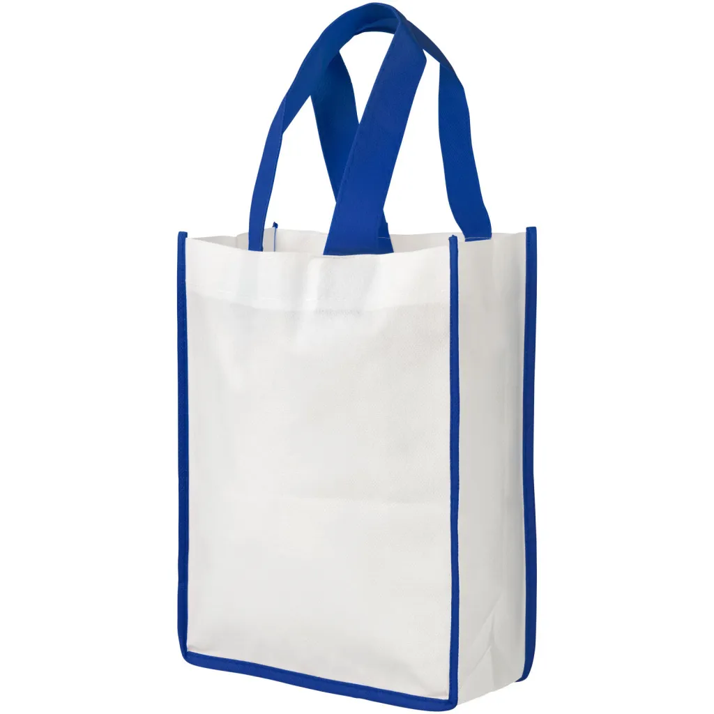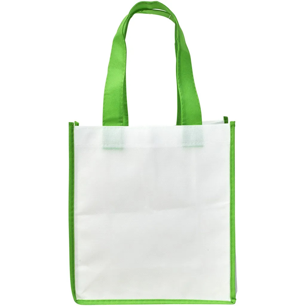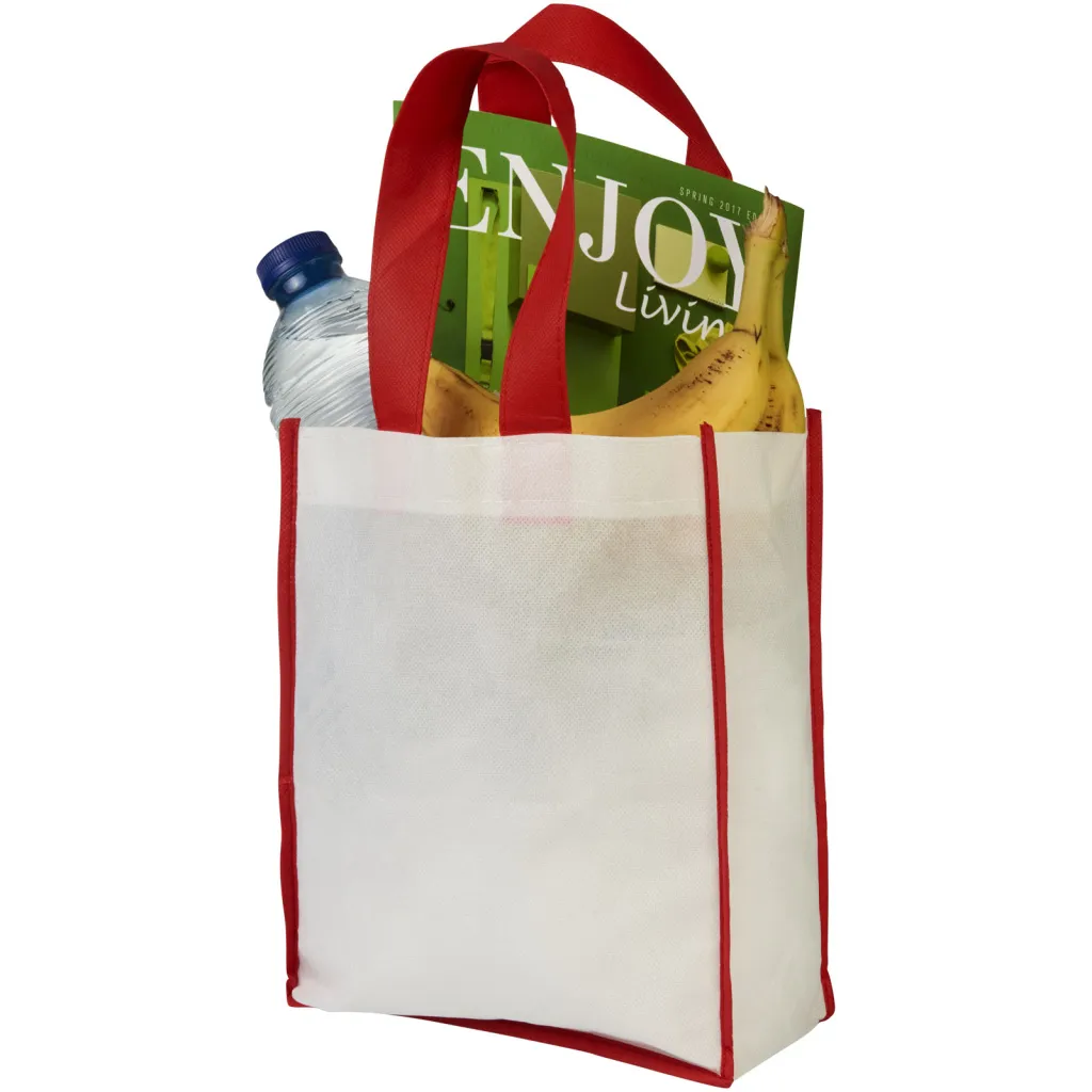 Torba za kupovinu izrađena od bijelog netkanog PP materijala s ručkama i obrubima u boji. Svjež i šaren dizajn. Mala vrezija.
