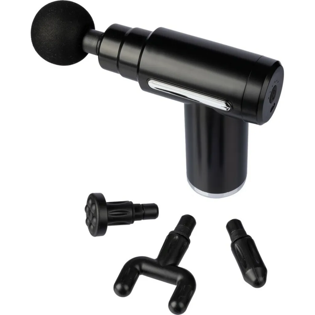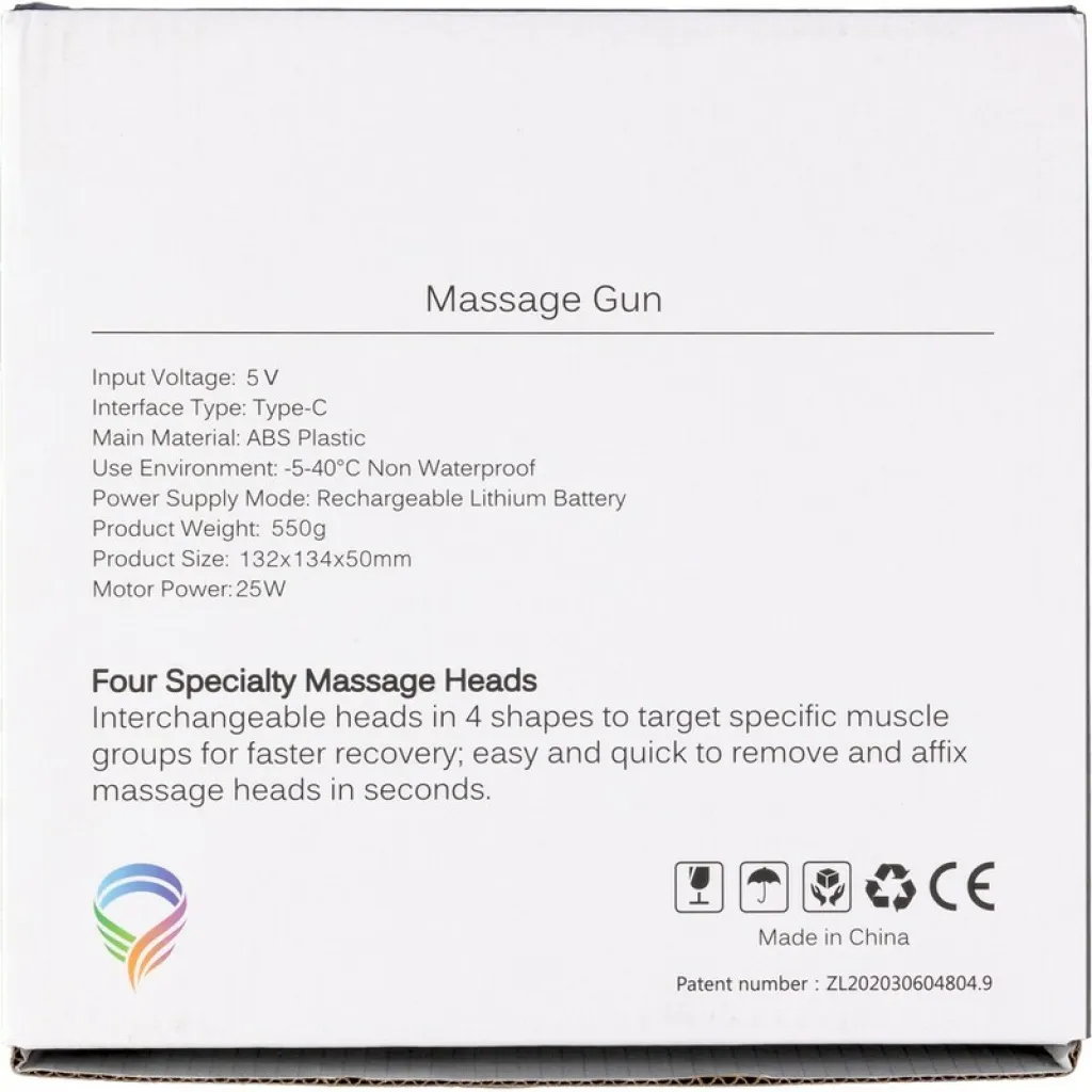 Masažer mišića s istosmjernim motorom s četkicama (1800 - 3200 okretaja u minuti) i punjivom baterijom od 1200 mAh, 5V ulaz i šest razina intenziteta masaže. Pomaže u opuštanju nakon stresnog dana s četiri masažne glave. Poklon kutija uključena. Izrađen od ABS materijala.