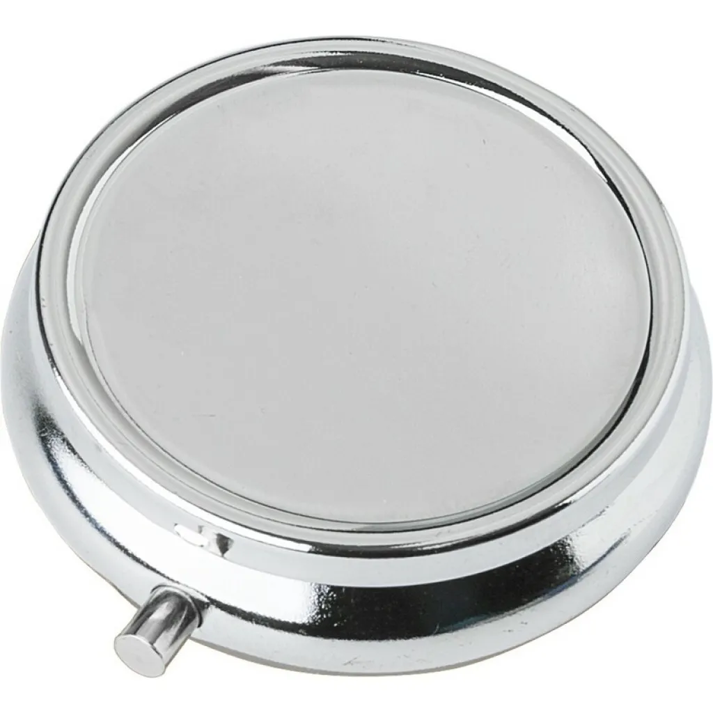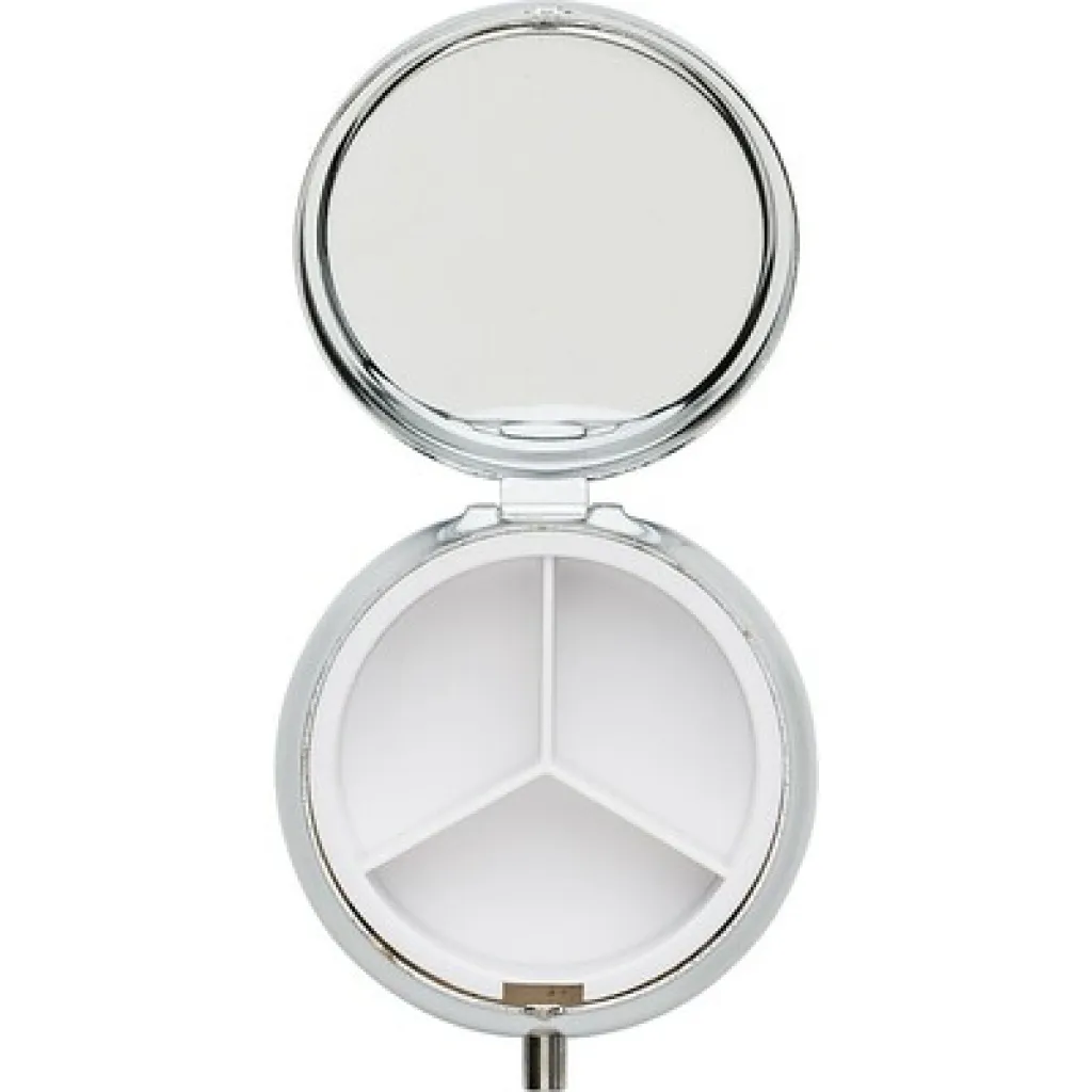 Metalna kutija za tablete s tri odjeljka i ogledalom u poklopcu.