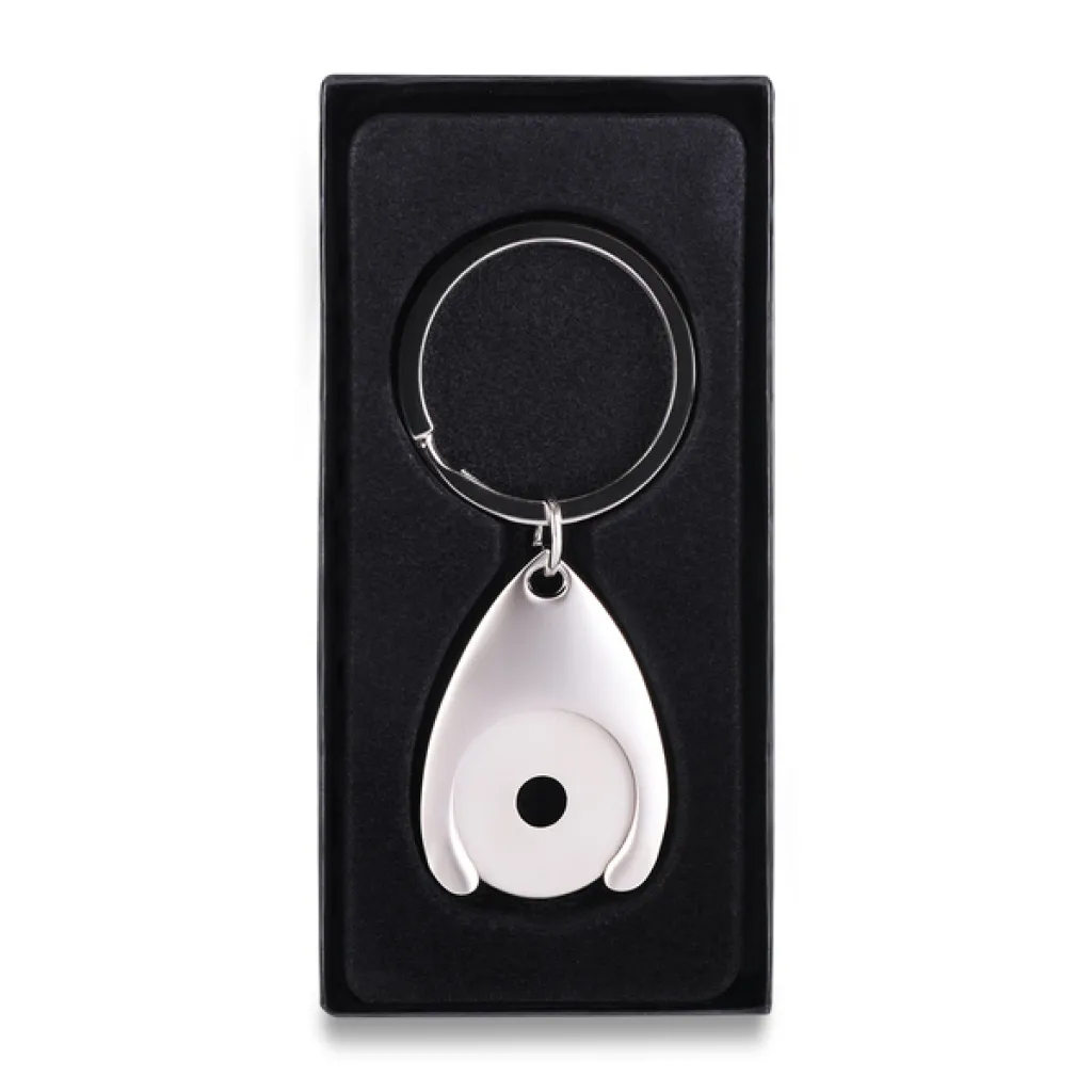 Metalni privjesak za ključeve s čipom u košarici u veličini 1 EUR u crnoj poklon kutiji.