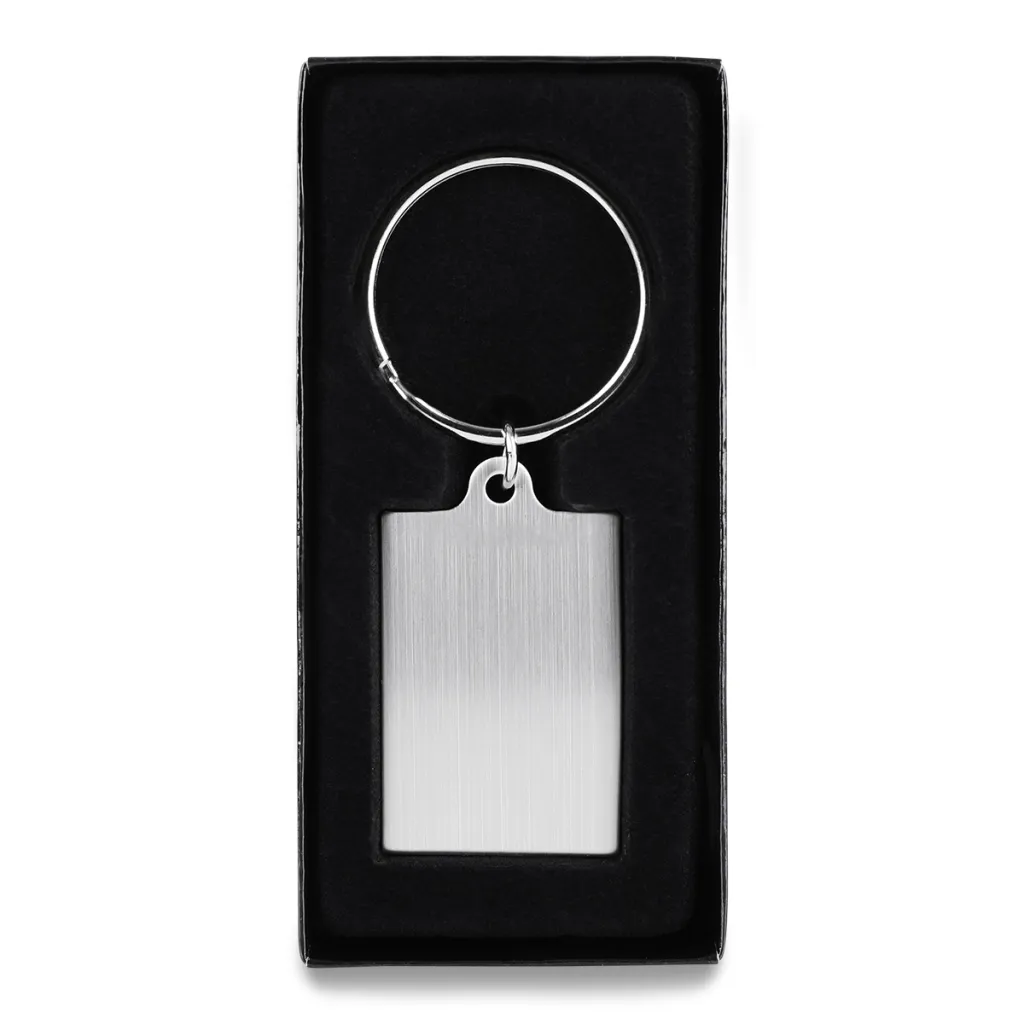 Privjesak za ključeve izrađen od metala u crnoj poklon kutiji.