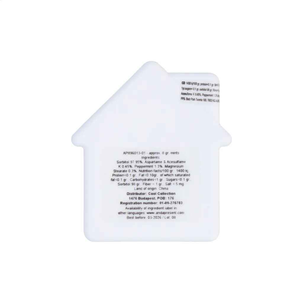 Plastična kutijica s mint bombonima, u obliku kućice s okvirno 8 grama mentol bombona bez šećera.