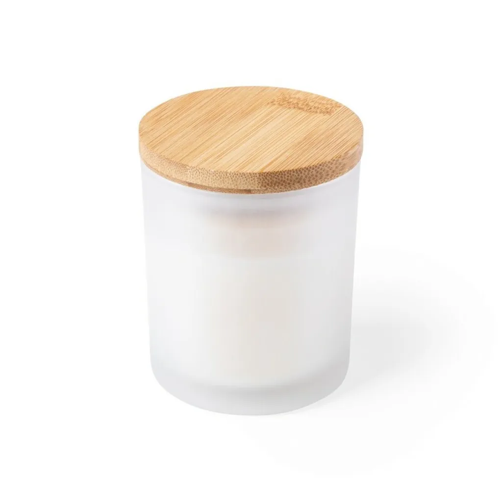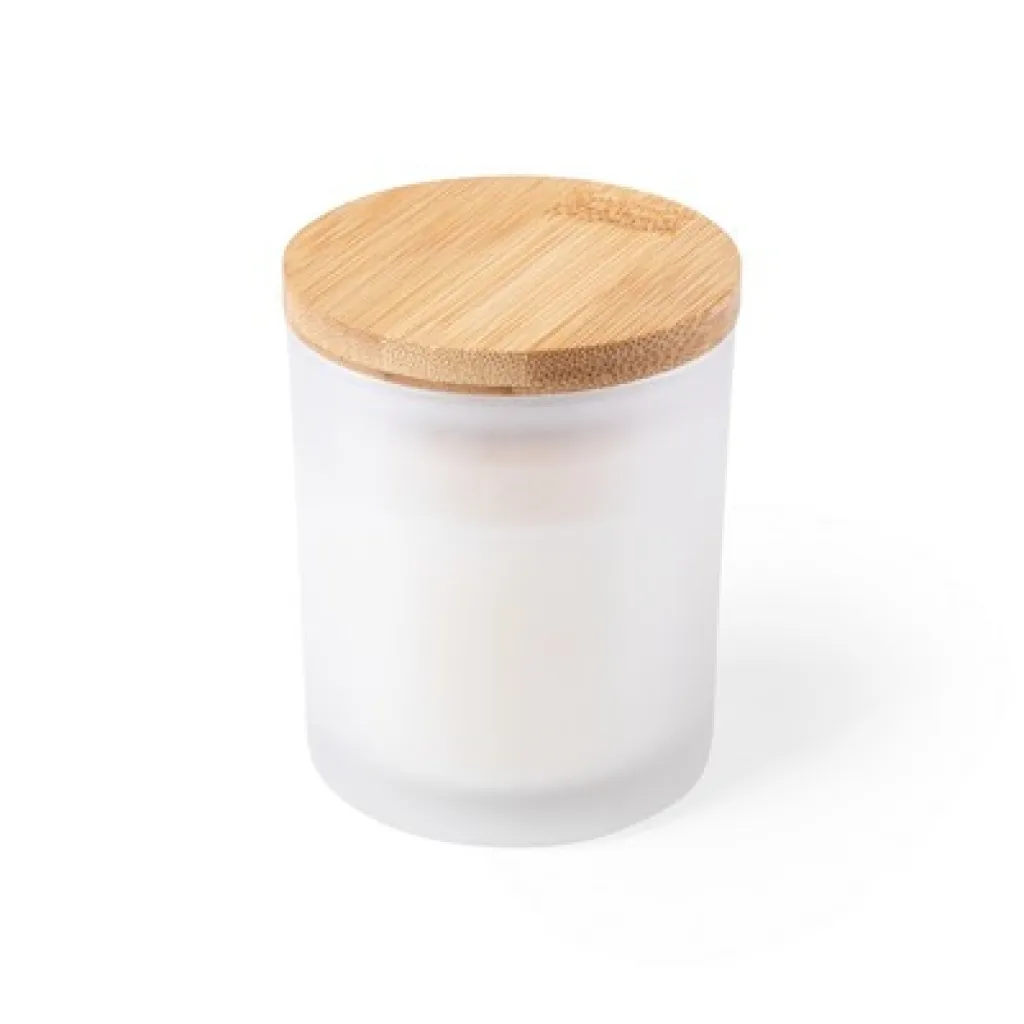 Svijeća s aromom vanilije, u staklenom svijećnjaku s poklopcem od bambusa.