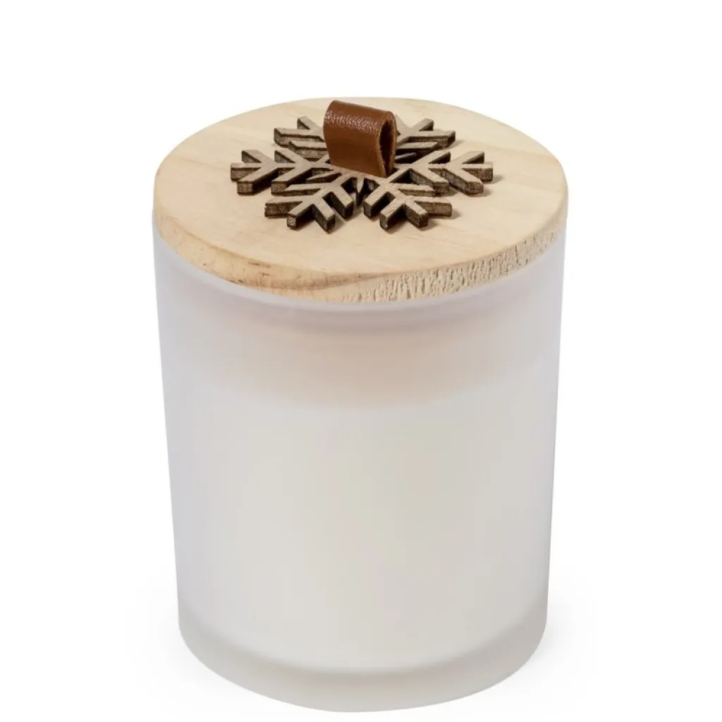Mirisna svijeća s aromom vanilije, u staklenom svijećnjaku s drvenim poklopcem s motivom pahulje.