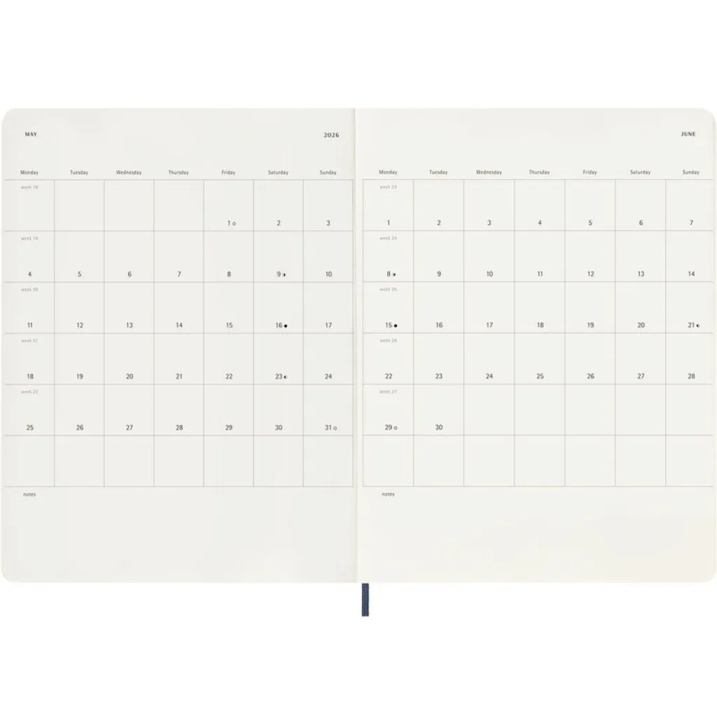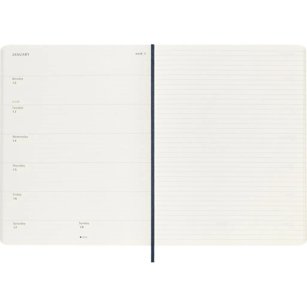 MOLESKINE dnevnik s bilježnicom (XL), meke korice, organiziran po tjednima (144 stranice), vrpca za označavanje stranica i elastična traka za zatvaranje.