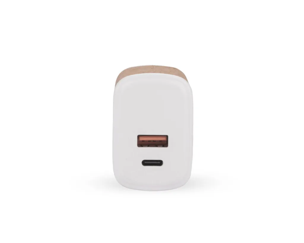 Mrežni punjač BLOSETO praktičan je uređaj za punjenje mobilnih uređaja pomoću ugrađenog USB A priključka i tip C priključka. Punjač ima 20W QC 3.0 funkciju brzog punjenja. Ima završetak od pluta što joj daje neobičan izgled.