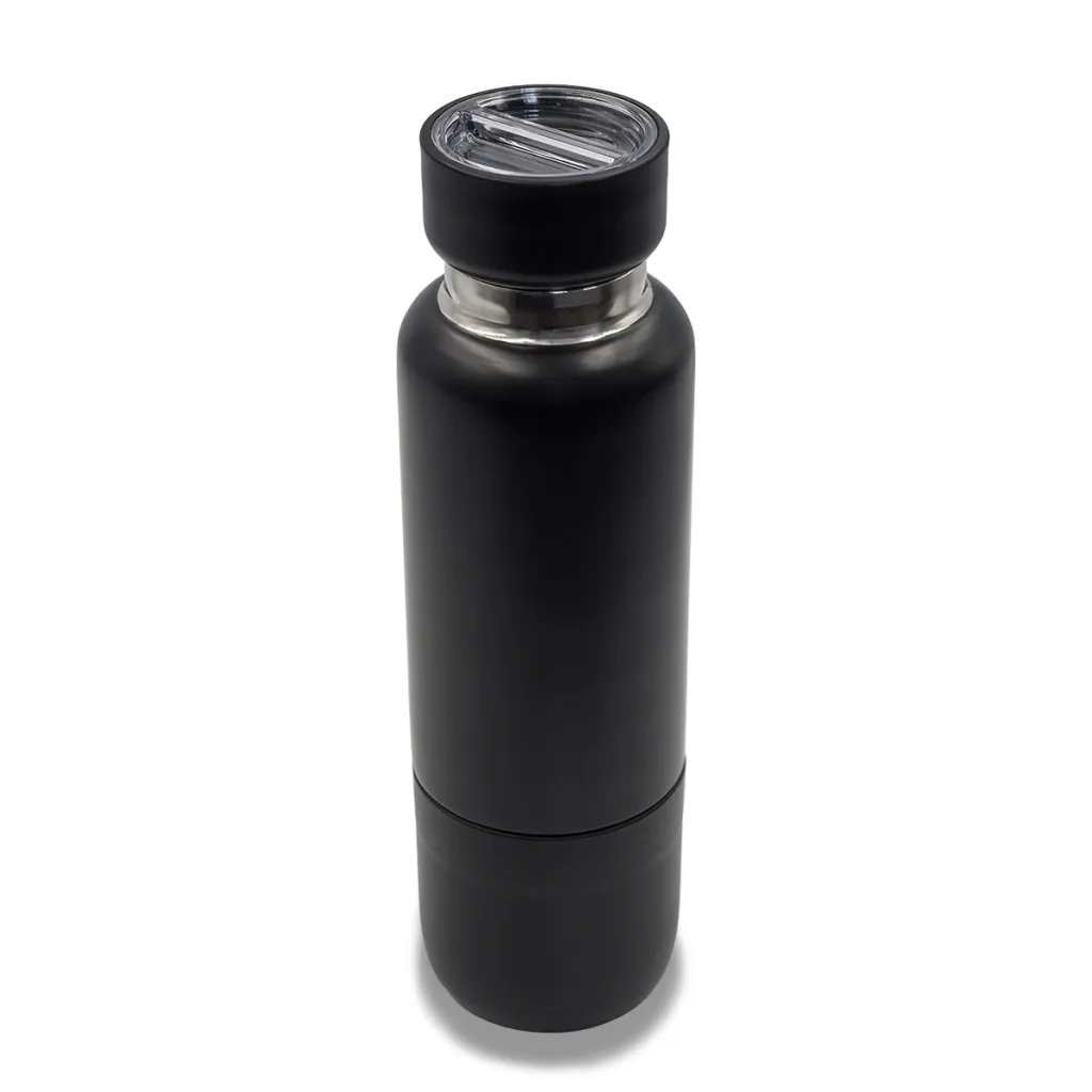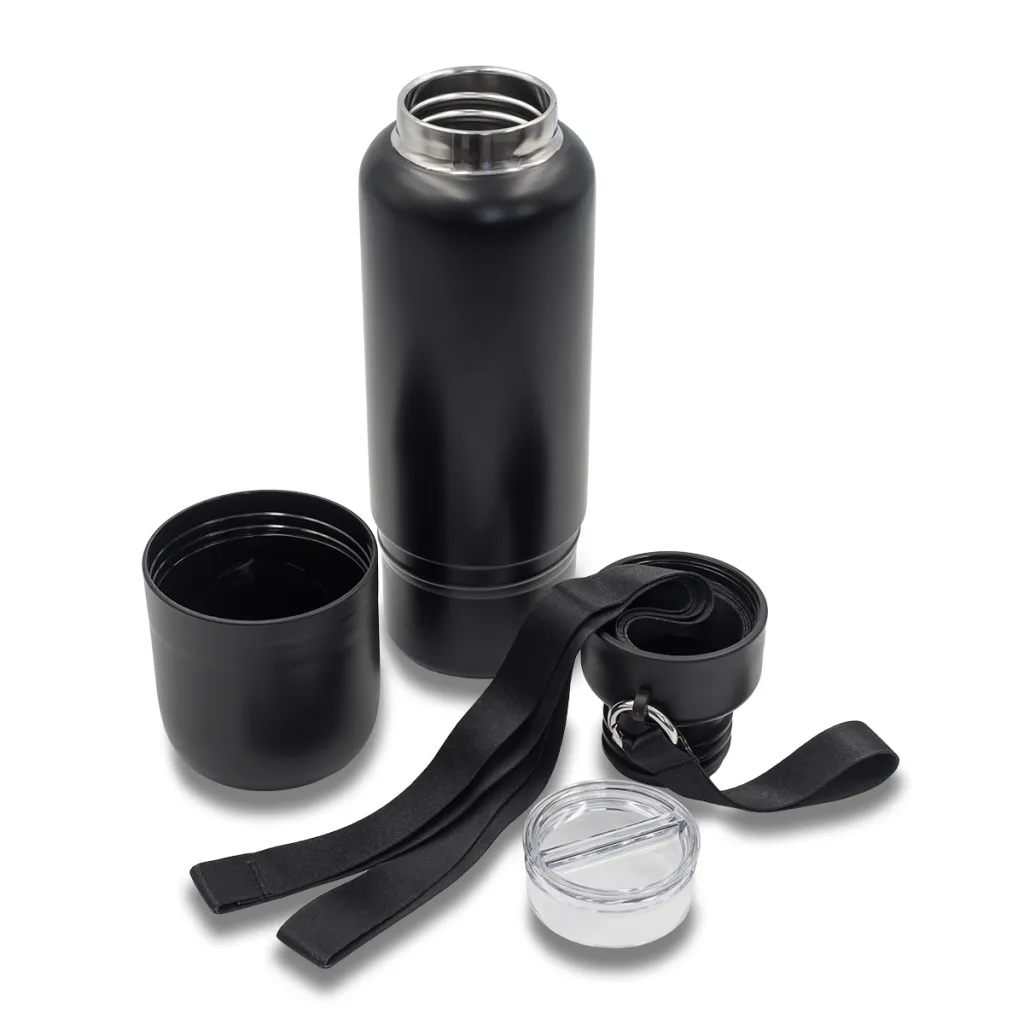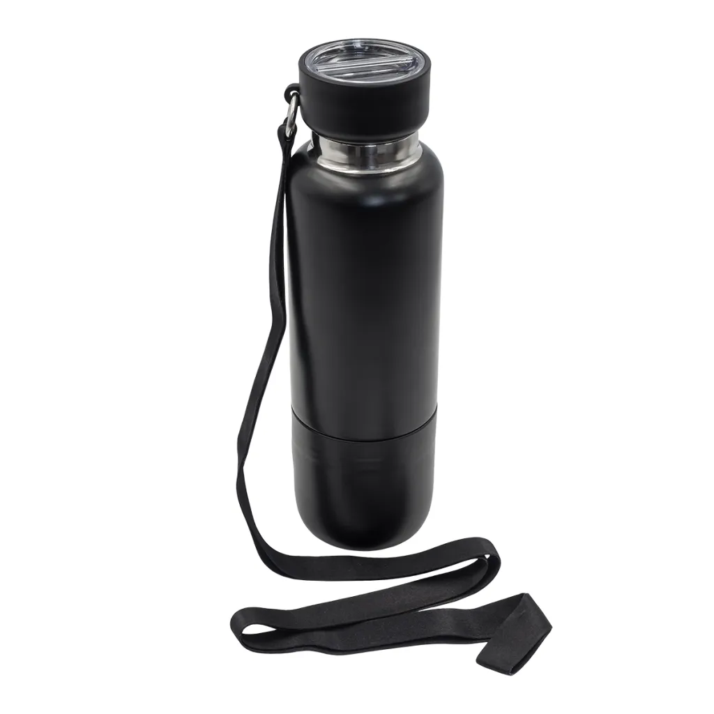 Vakuumska boca od nehrđajućeg čelika s dvostrukom stijenkom. Ima čvrsto zatvoren poklopac s funkcijom pohranjivanja. Dolazi s odvojivim trakama u dvije veličine: za zapešće i za stavljanje na rame. Uklonjiva baza s funkcijom šalice. Održava temperaturu od 40 stupnjeva Celzijusa do 12 sati.