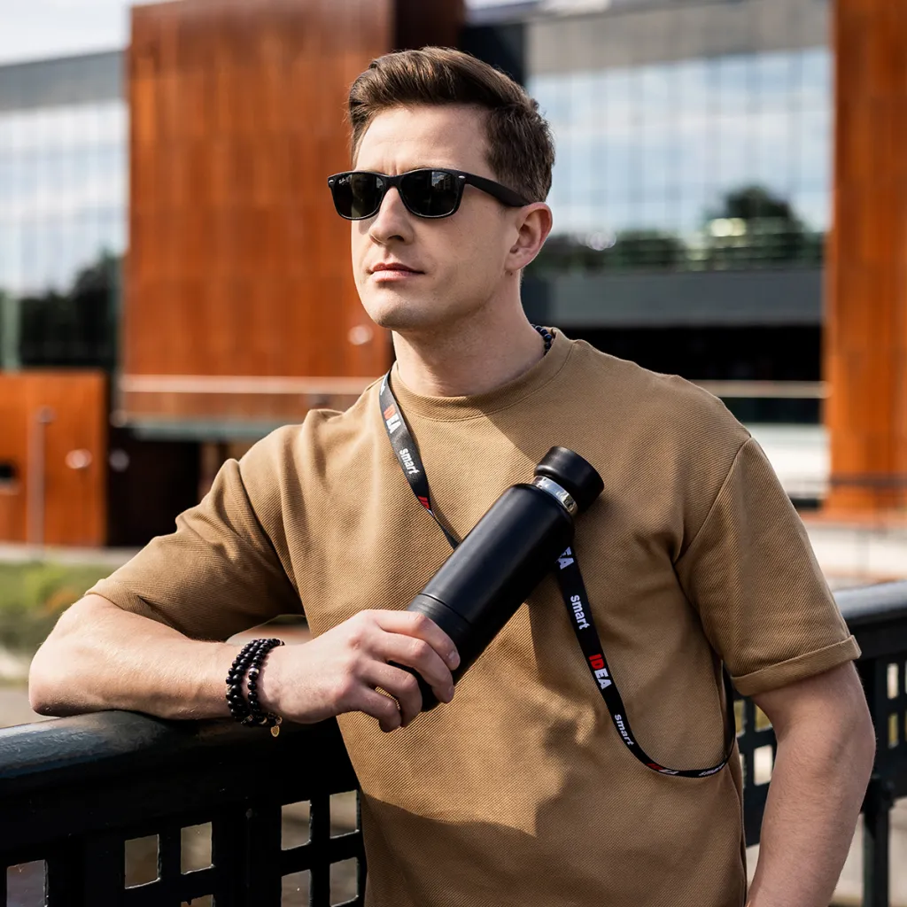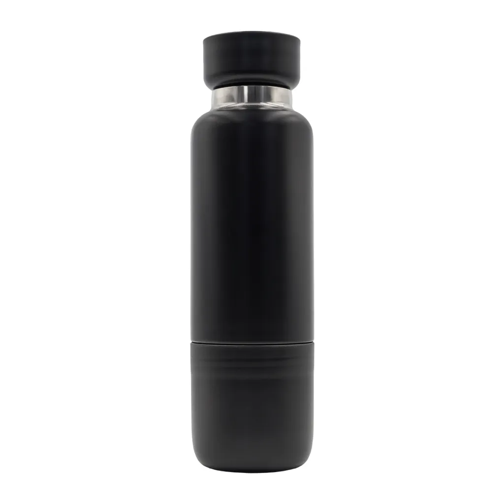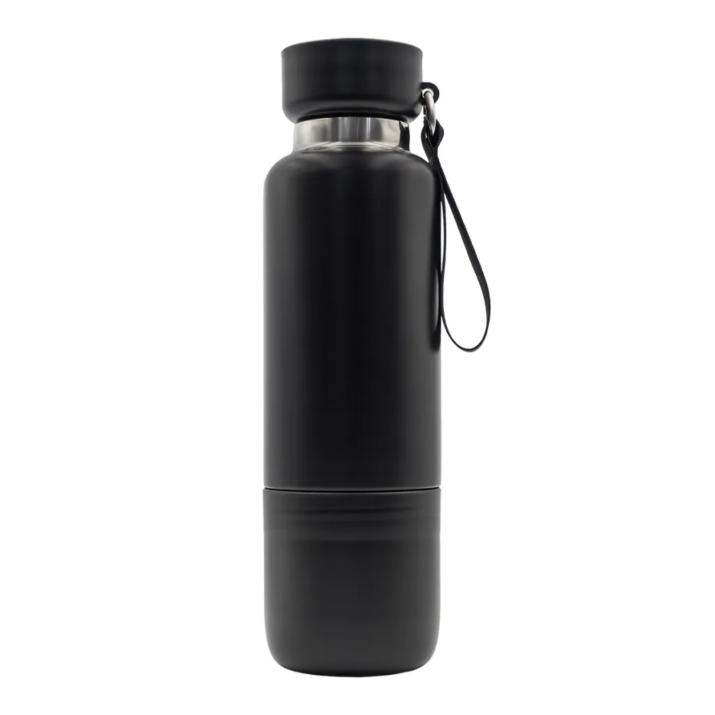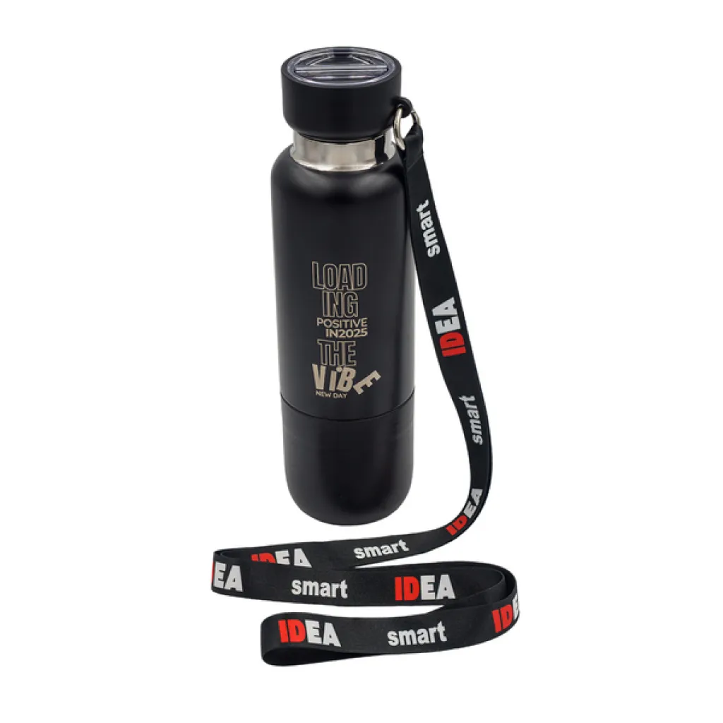 Vakuumska boca od nehrđajućeg čelika s dvostrukom stijenkom. Ima čvrsto zatvoren poklopac s funkcijom pohranjivanja. Dolazi s odvojivim trakama u dvije veličine: za zapešće i za stavljanje na rame. Uklonjiva baza s funkcijom šalice. Održava temperaturu od 40 stupnjeva Celzijusa do 12 sati.