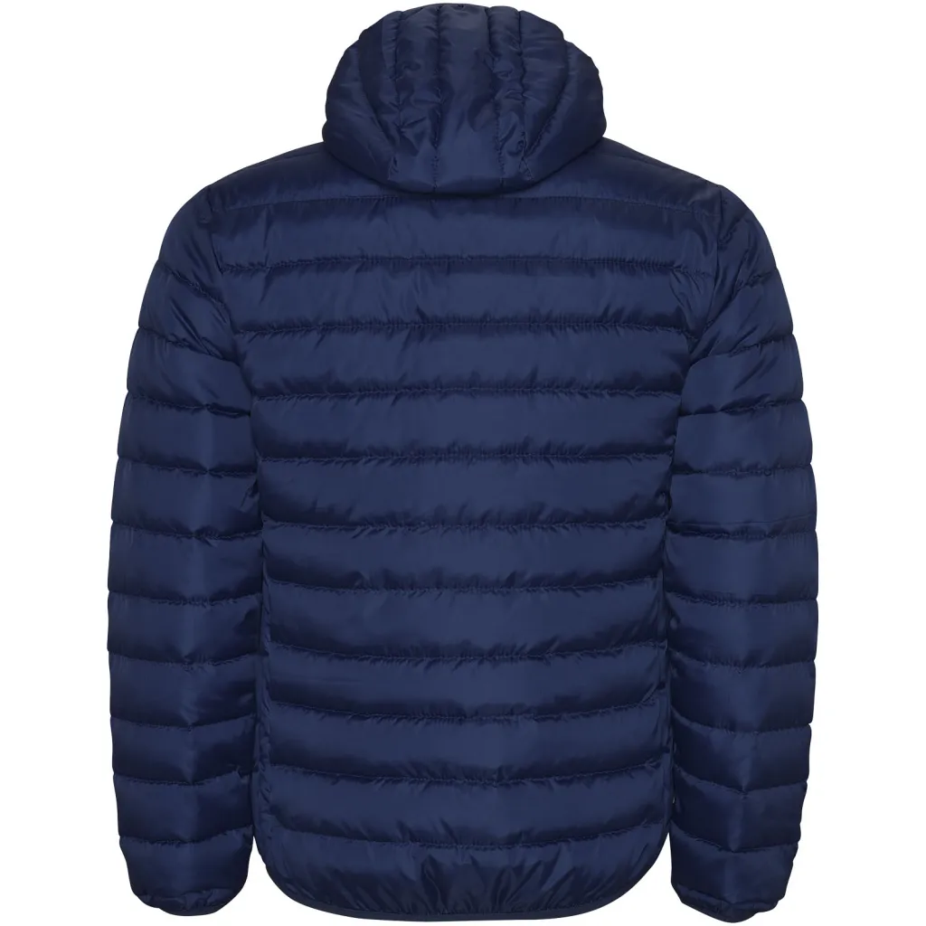 Muška prošivena jakna s podstavom s efektom perja i uklopivom kapuljačom. Obrnuti patentni zatvarači s usklađenim štitnikom za bradu. Dva prednja džepa s patentnim zatvaračima. Elastični obrub u istoj boji na manžetama, donjem rubu i kapuljači. Kontrastna unutarnja podstava. Uključuje vrećicu za sklapanje i nošenje. Lagan i sklopiv odjevni predmet. Vodootporan i otporan na vjetar.