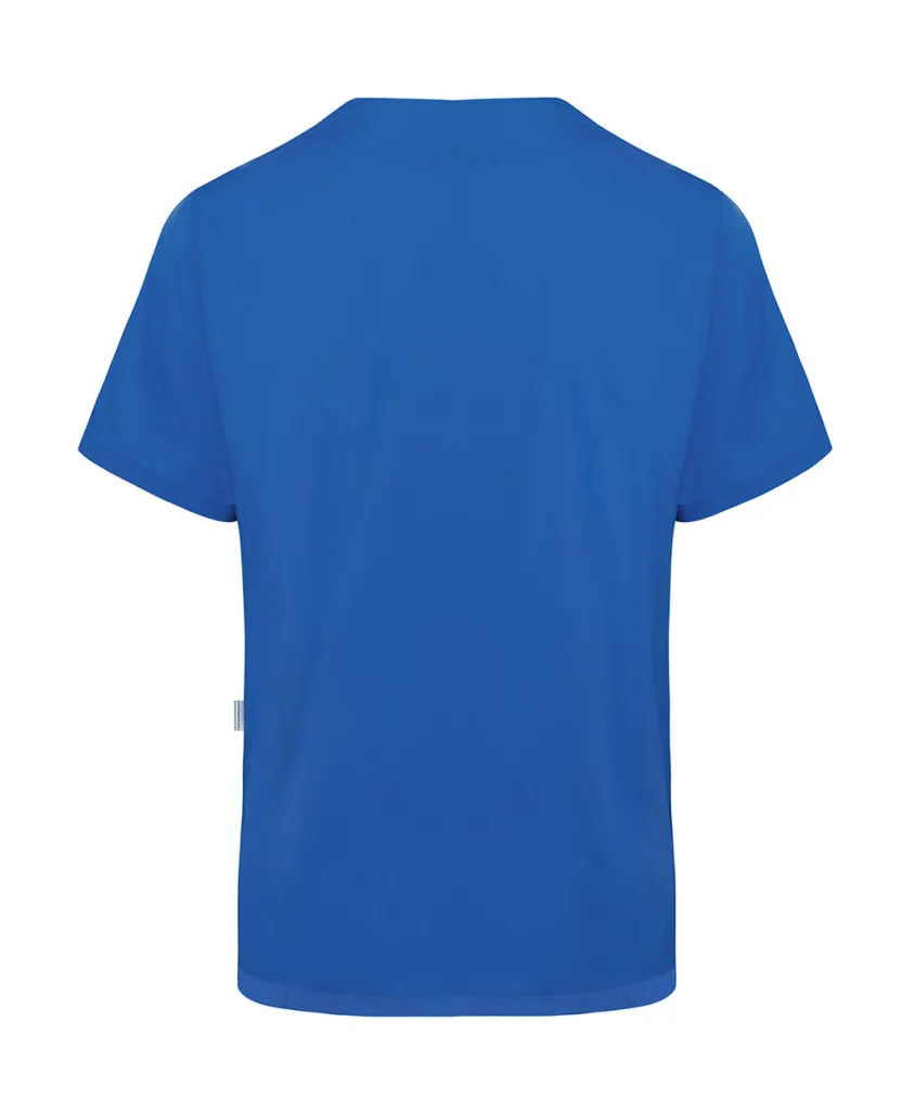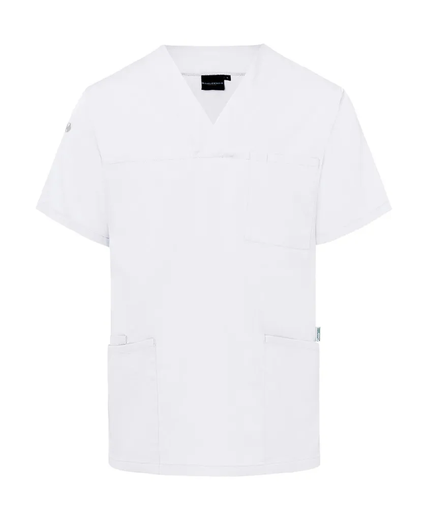 ·150 g/m² ·65% poliester (reciklirani), 35% pamuk (twill) ·Lagana tkanina ·Postojanih boja, jednostavna za održavanje, održiva ·V-izrez ·Našiveni bočni džepovi, jedan sa skrivenim unutarnjim džepom ·Omča u bočnom džepu za pričvršćivanje privjeska za ključeve ·Džep na lijevoj strani prsa s pretincem za olovku ·Ravni kroj ·Pranje na temperaturama do 95°C