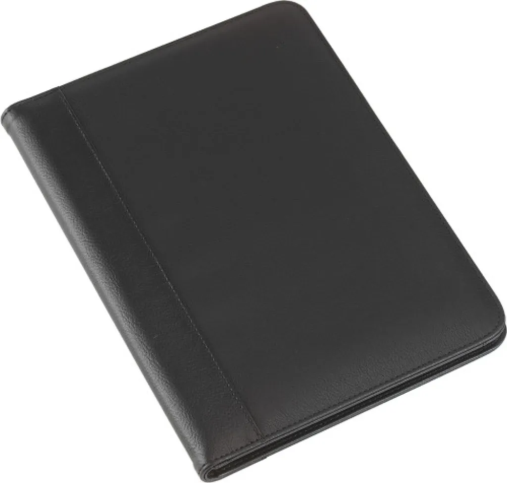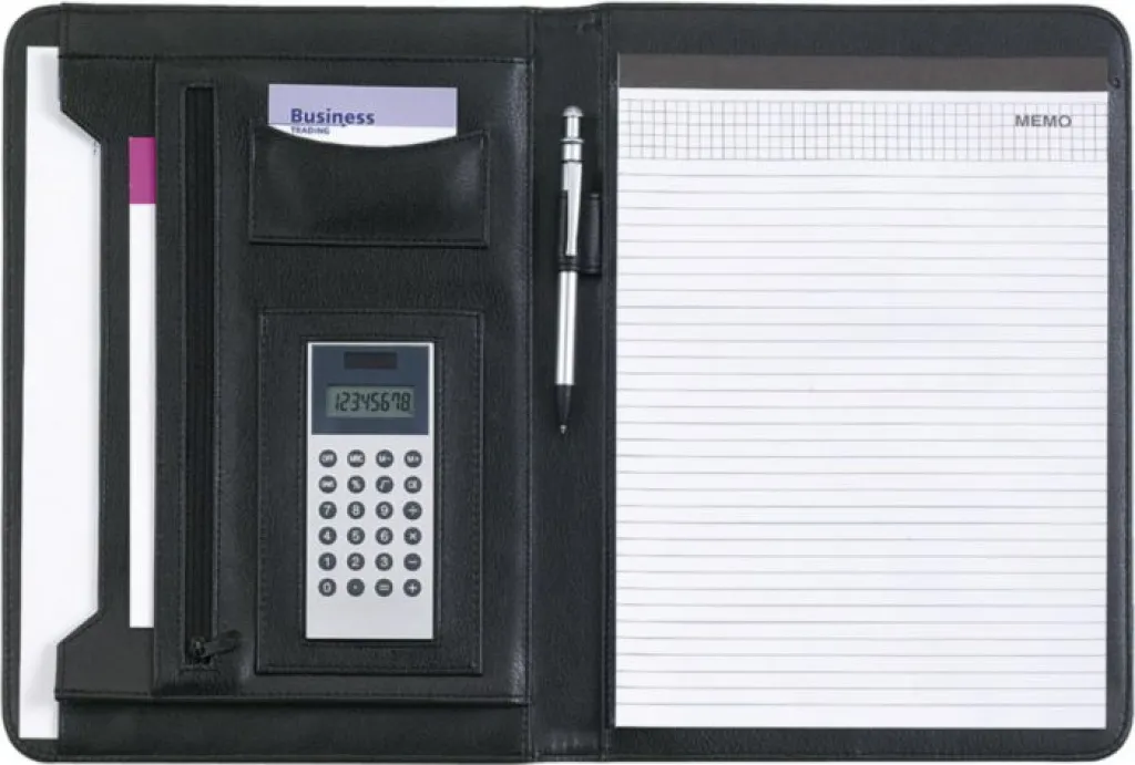 PU konferencijska mapa (približno A4 format) sa blokom od 20 stranica na crte, više džepova i kalkulatorom. Baterije su uključene.