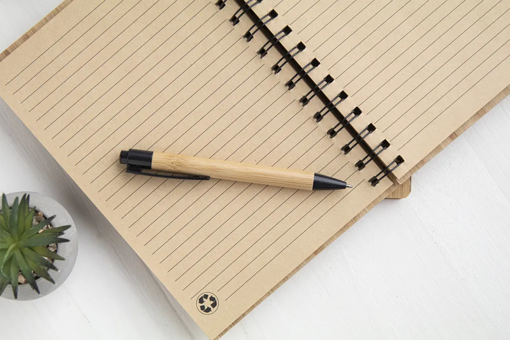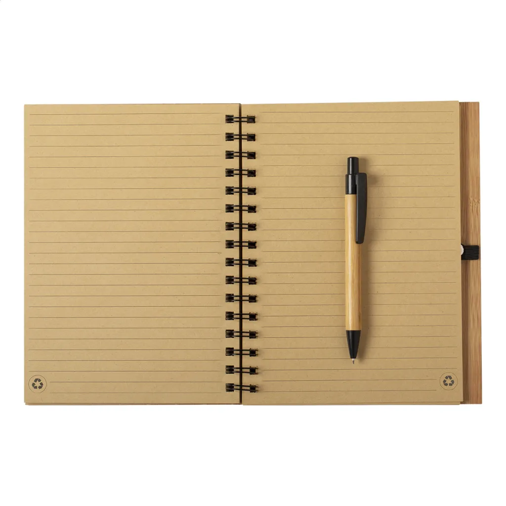 Notes A5 s koricama od bambusa spiralno uvezan, s kemijskom olovkom od bambusa (crna tinta) i 80 listova s crtama.