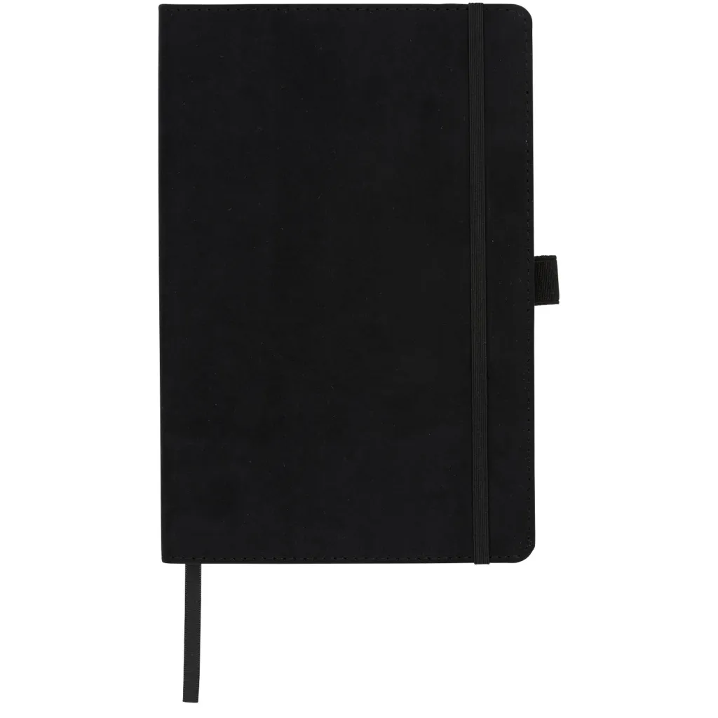 Notes A5 s tvrdim koricama od imitacije brušene kože. Notes sadrži 80 bež listova s crtama (80gsm), elastičnu traku za zatvaranje i vrpcu za označavanje stranica u odgovarajućoj boji. S unutanje strane stražnjih korica nalazi se dodatni pretinac za kartice i posjetnice. Pakirano u crnoj poklon kutiji.