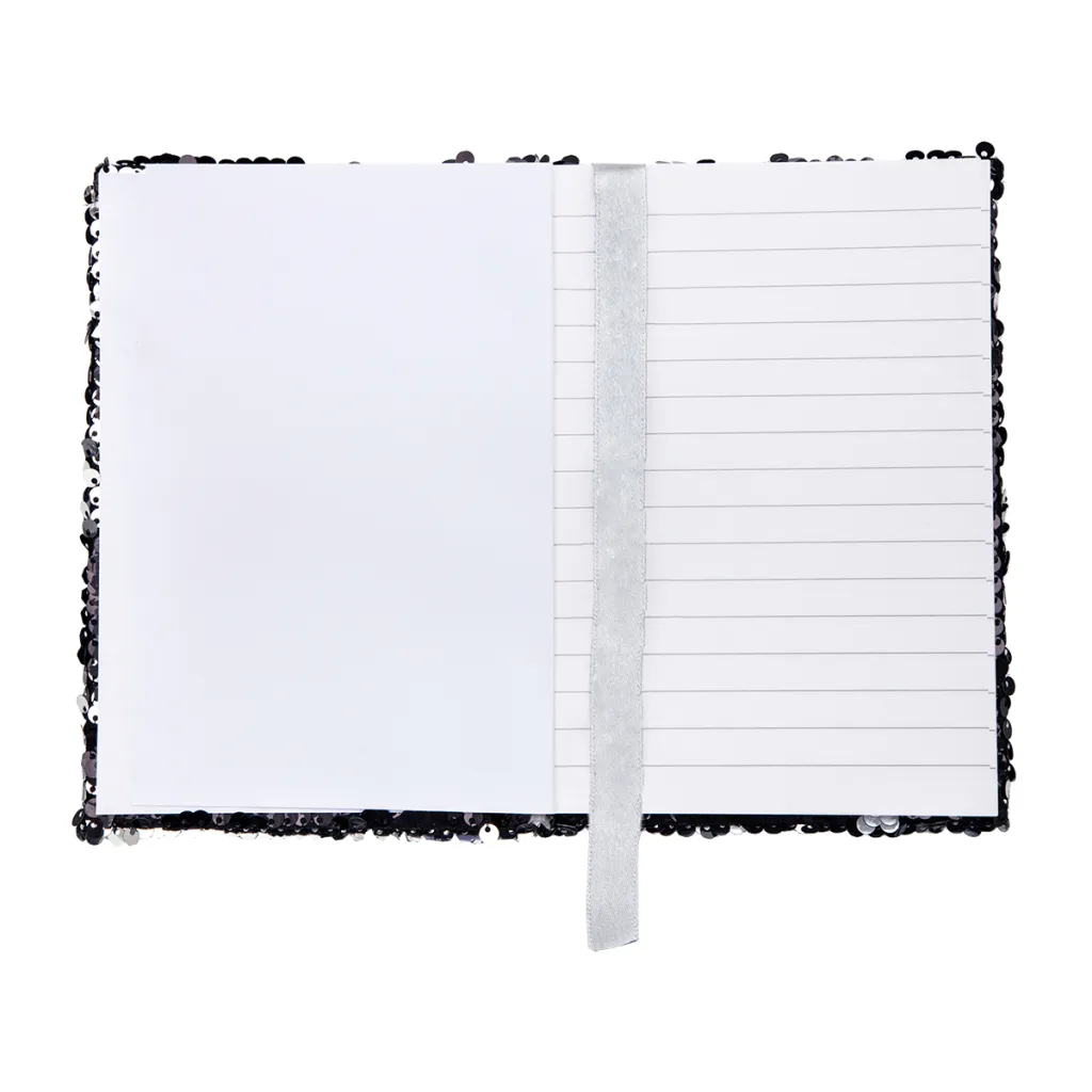 Šljokičasta bilježnica B6 s šljokicama u crnoj i srebrnoj boji. Srebrna vrpca (širine 15 mm) s prostorom za vaš logotip. Papir 70 g / m2, 160 stranica.