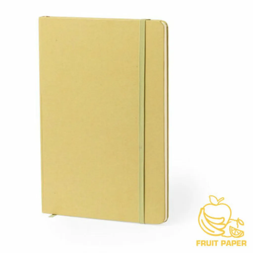 Bilježnica (okvirne dimenzije A5, 80 listova s crtama) od recikliranog kartona i voćnog papira, tvrdi uvez, traka za označavanje i elastična traka za zatvaranje.