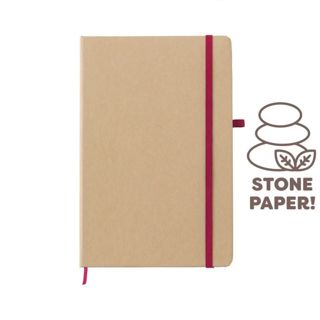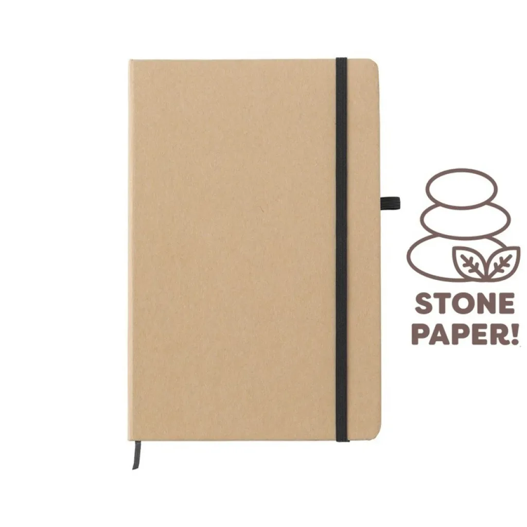Notes (veličine približno A5, 80 listova s crtama izrađenih od kamenog papira) s tvrdim koricama izrađenim od natron papira, elastičnom trakom za zatvaranje i petljom za kemijsku olovku.