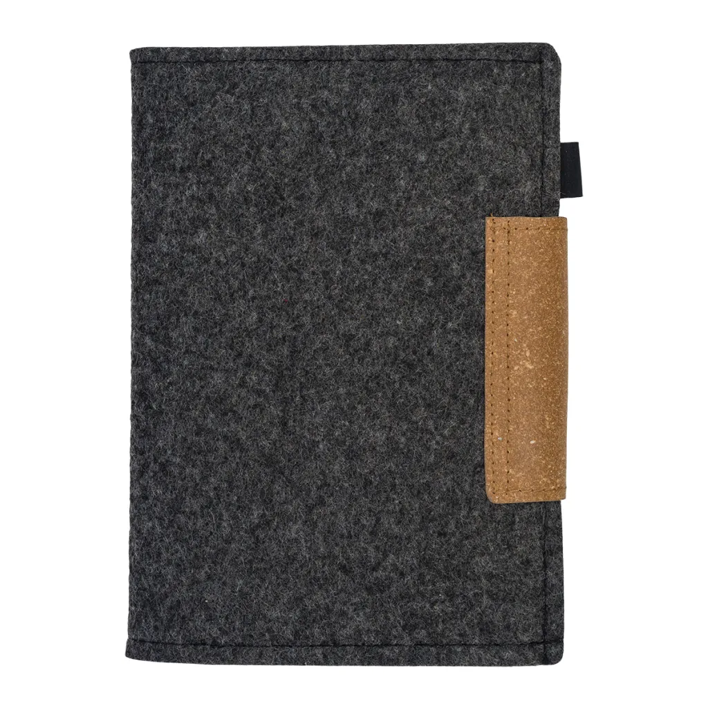 A5 RPET Notes/organizator s filc ovitkom i zatvaračem od reciklirane kože. Unutar korice nalaze se džepovi, npr. za telefon, olovku i posjetnice. Zamjenjivi A5 notes s crtama (80 listova 70 g/m2).