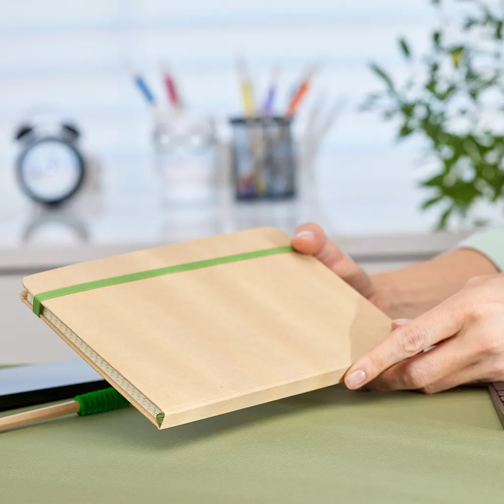 Notes s tvrdim koricama. Dolazi s elastičnom trakom za zatvaranje. 70 g chamois creme papir na kvadrat, 80 stranica.