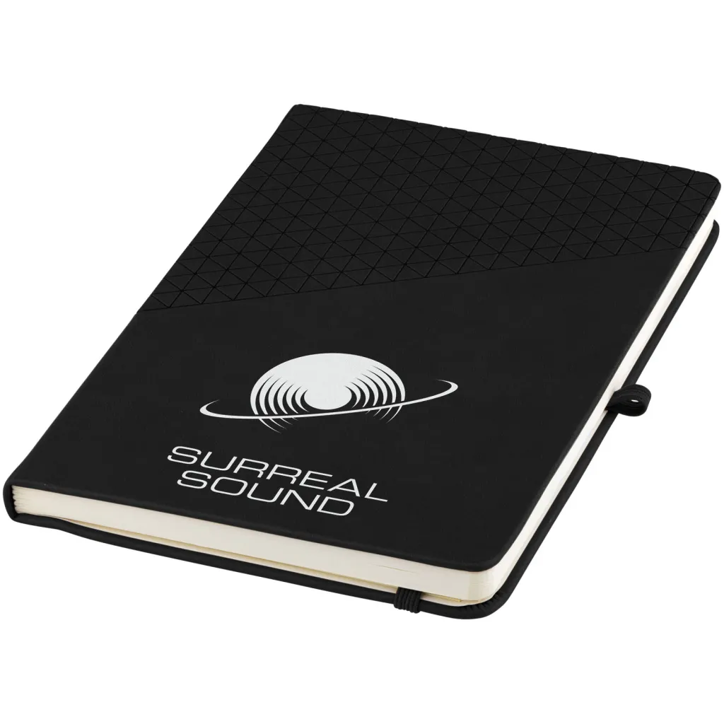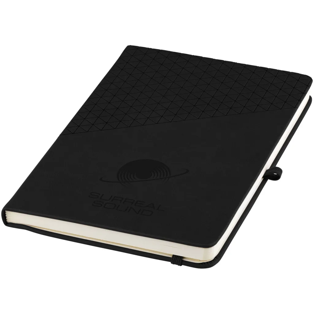 Notes A5 sa soft touch koricama i geometrijskim uzorkom. Sadrži 80 listova papira s crtama (80 g / m2), elastičnu traku, držač kemijske olovke, vrpcu za označavanje stranice.