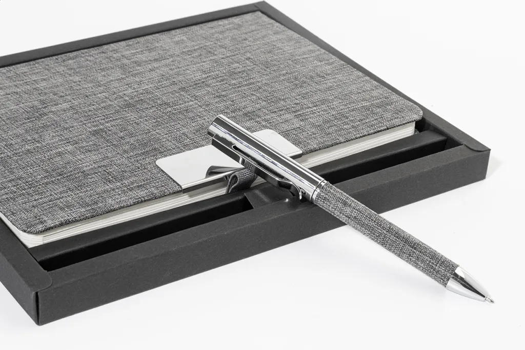 Set se sastoji od A5 notesa s koricama prekrivenim 300D RPET poliesterom sa 100 listova s crtama i elastičnom trakom za zatvaranje te od metalne kemijske olovke prekrivene RPET poliesterom s plavim punjenjem.
