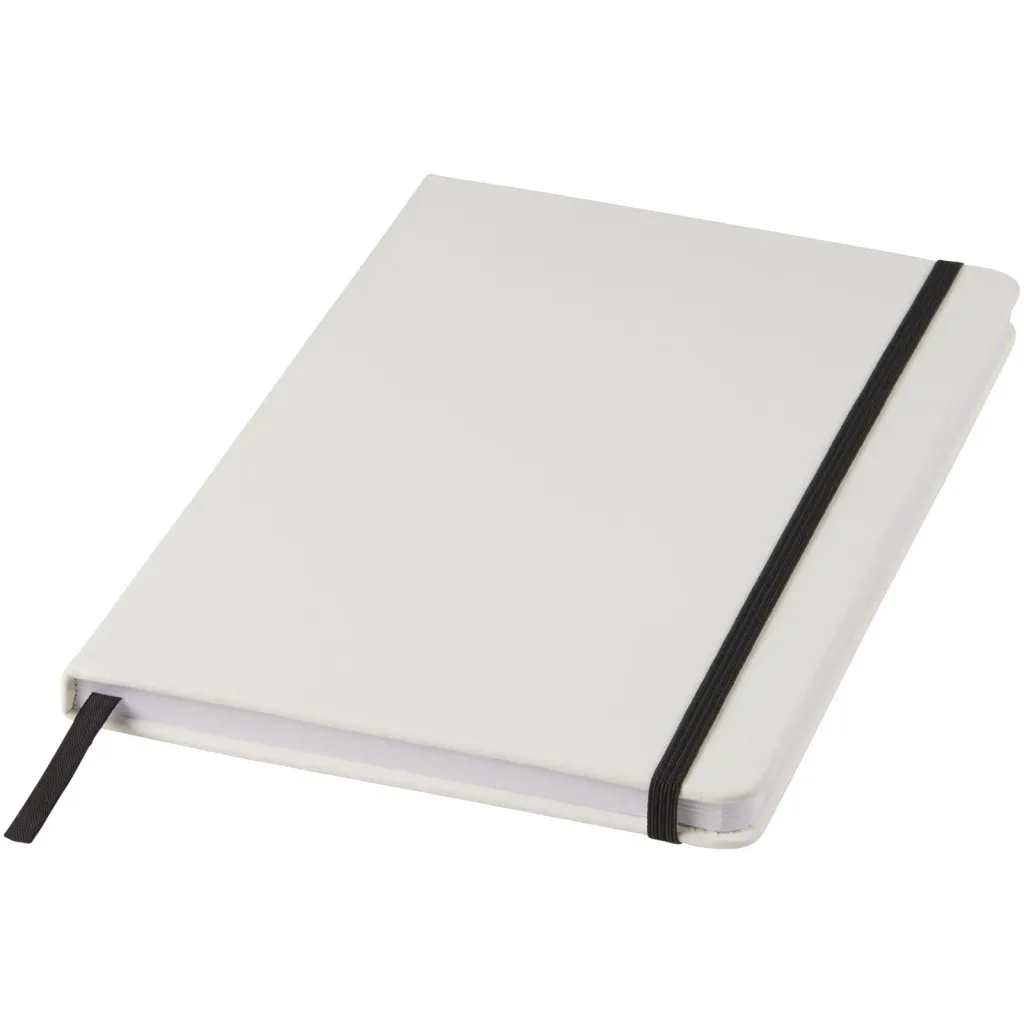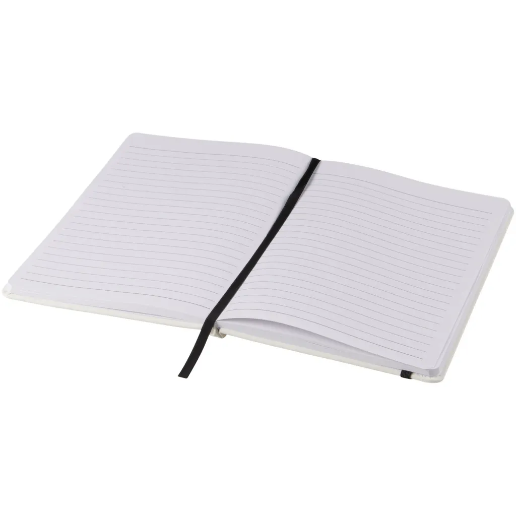 Bijeli A5 notes s elastičnom trakom i vrpcom u istoj boji. Sadrži 80 listova papira s crtama (60g/m2). Moguć je tisak na koricu.