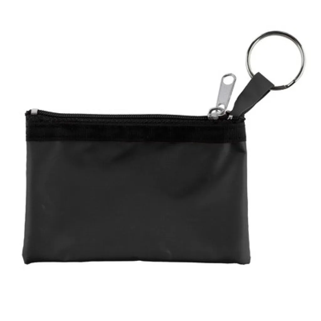 Novčanik za kovanice i ključeve s patentnim zatvaračem i metalnim prstenom za ključeve.