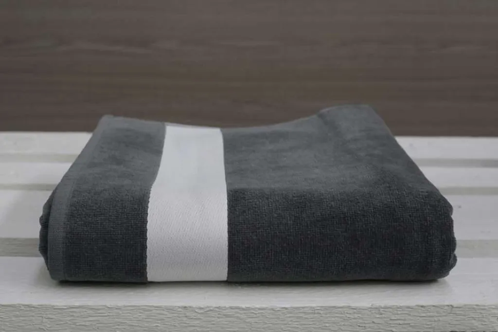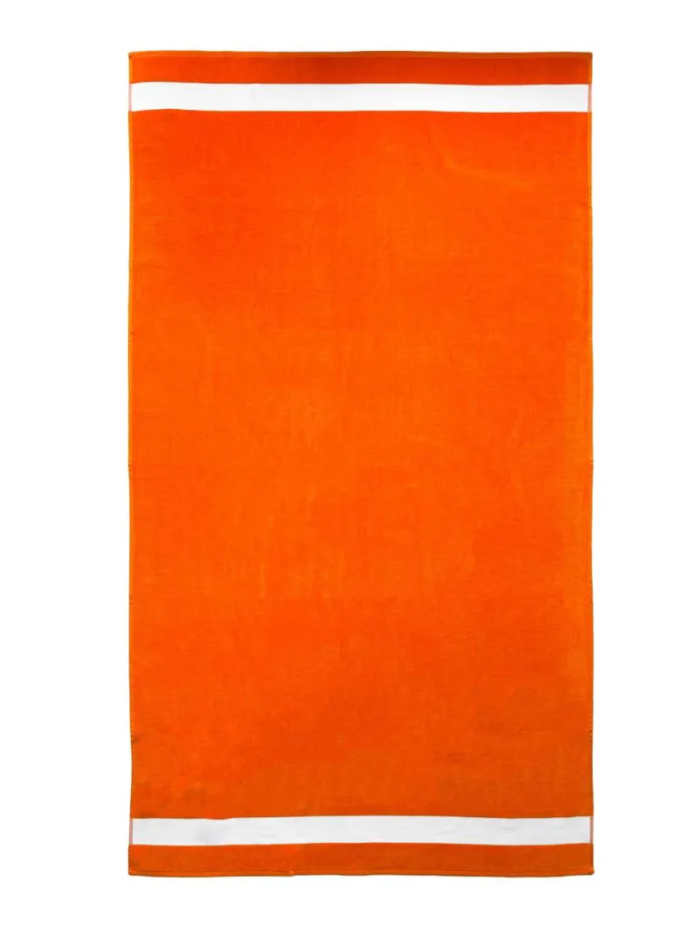 Ručnik za plažu od velura/frotira s bijelim sublimacijskim bordurama širine 5,5 cm.