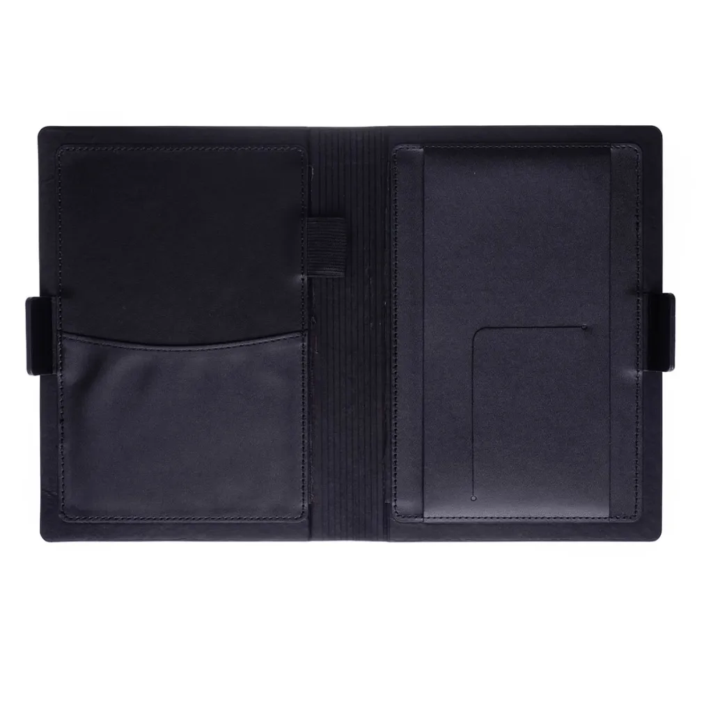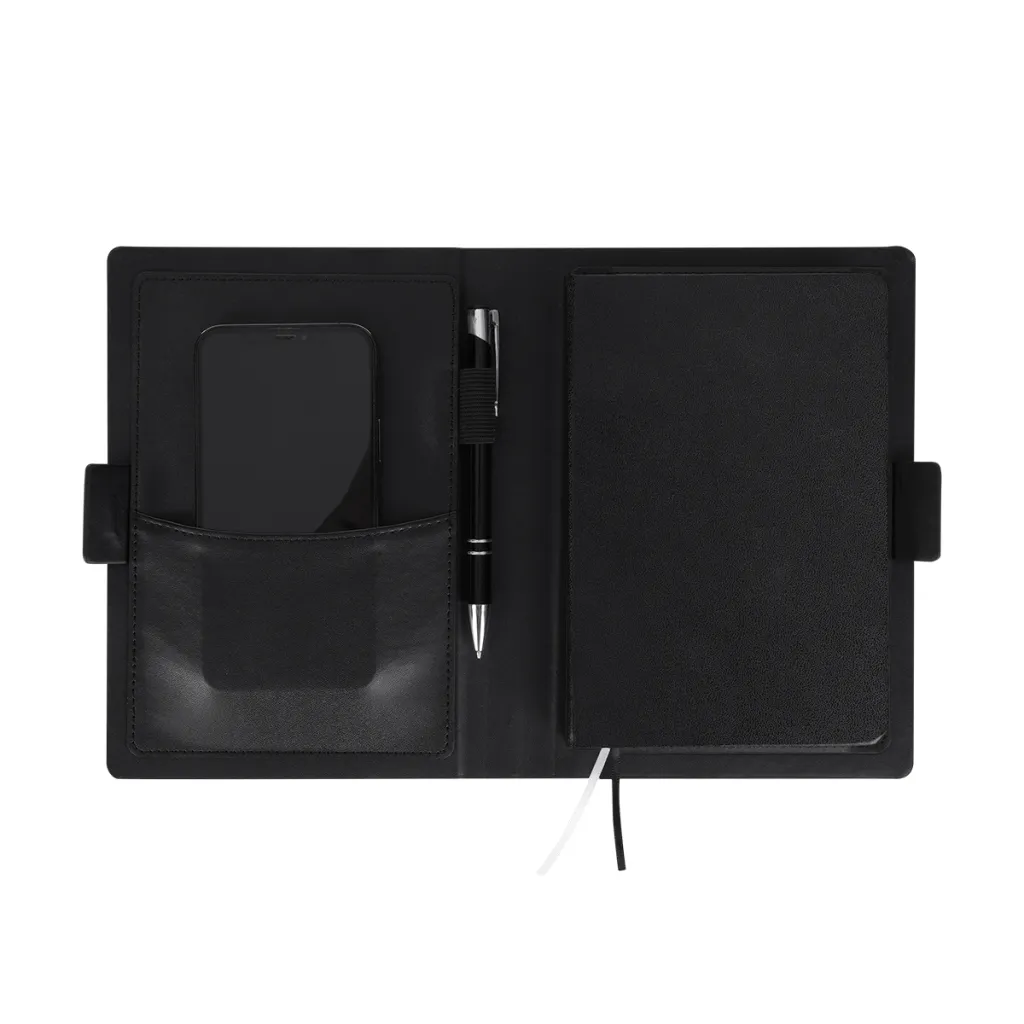 Elegantan organizator s notesom, ima odjeljak za mobitel, petlju za olovku i džep za posjetnice. S magnetskim zatvaranjem. Veličina 15,5 x21,5 cm.