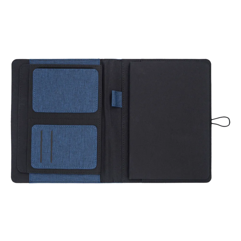 Organizator sa zamjenjivim A5 notesom (64 kockasta lista, 70g/m2). Tvrdi uveza od RPET tkanine. Organizator ima jedan veliki pretinac, tri manja džepa, džep za posjetnice i držač za olovke. Aktovka se kopča elastičnom trakom pričvršćenom na metalnu kuku.