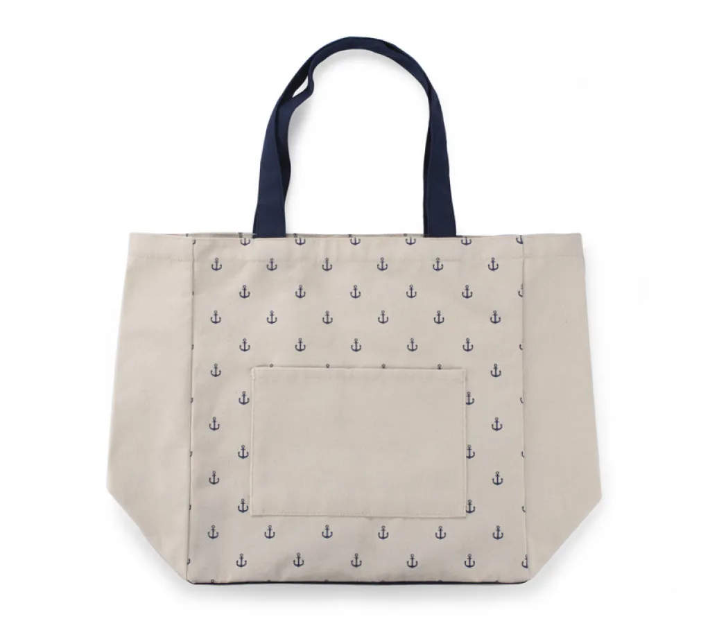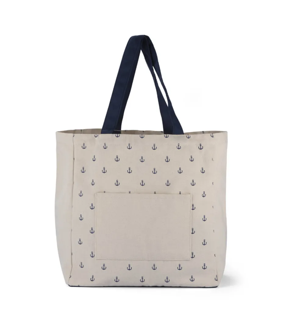 Prostrana torba s motivom sidra sastoji se od jednog pretinca, vanjskog bočnog džepa i duge ručke za vješanje na rame.