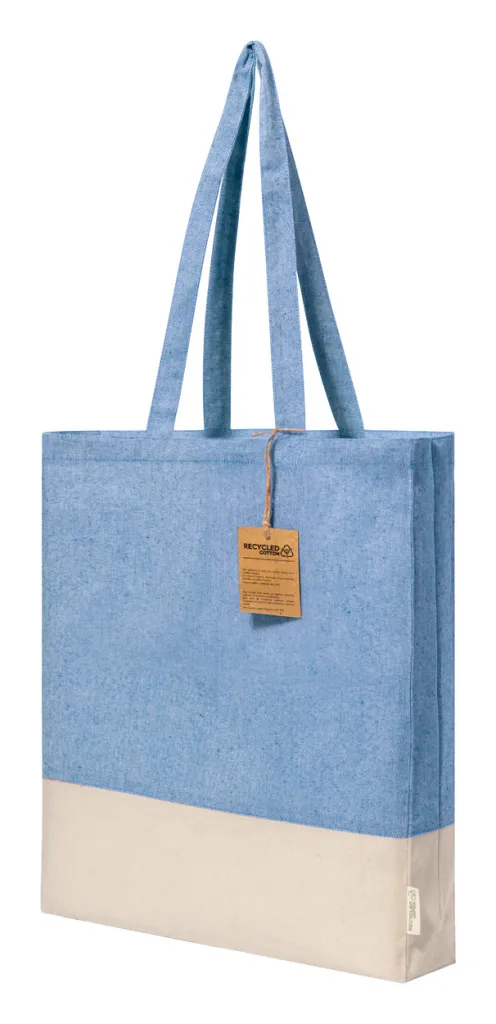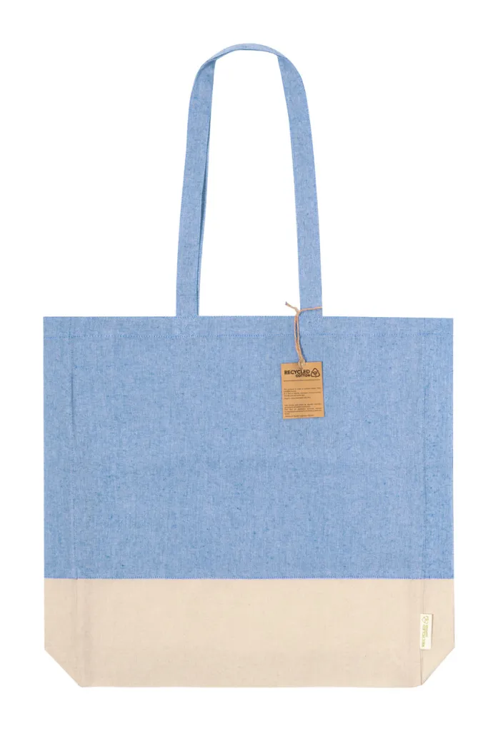 Dvobojna torba za kupovinu od recikliranog pamuka s ušicima, dugim ručkama i prepoznatljivom etiketom od recikliranog pamuka. 100% reciklirani pamuk, 120 g/m².