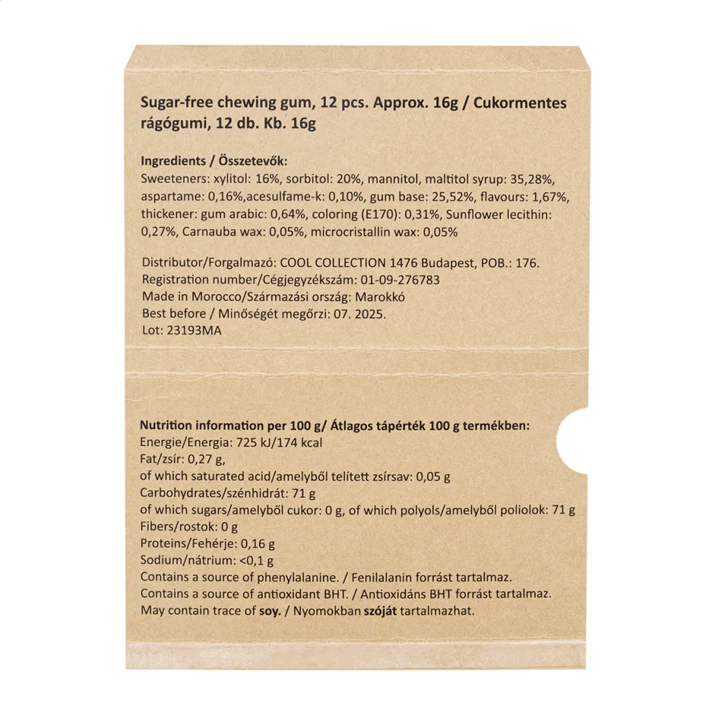 12 žvakaćih guma bez šećera u blisteru s omotom od kraft papira izrađenog po narudžbi u punoj boji. Minimalna količina narudžbe: 100 kom.