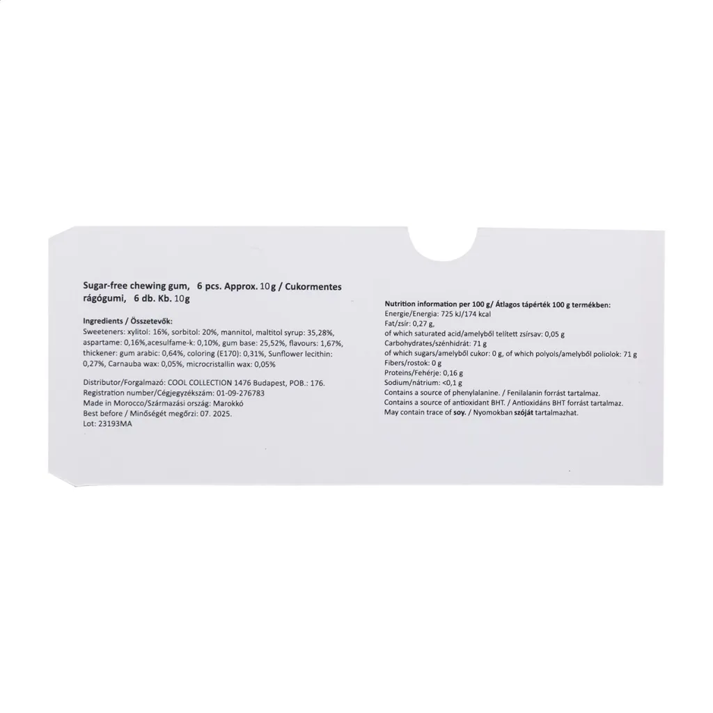 Šest žvakaćih guma bez šećera u blisteru s papirnatim omotom izrađenim po narudžbi u punoj boji. Minimalna količina narudžbe: 100 kom.